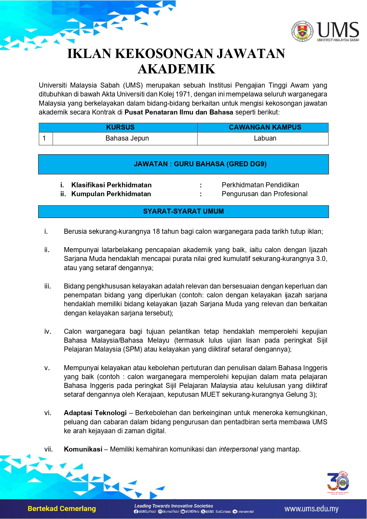 Iklan Pengambilan Jawatan Kakitangan Akademik (Bahasa Jepun) PPIB Kampus Antarabangsa Labuan