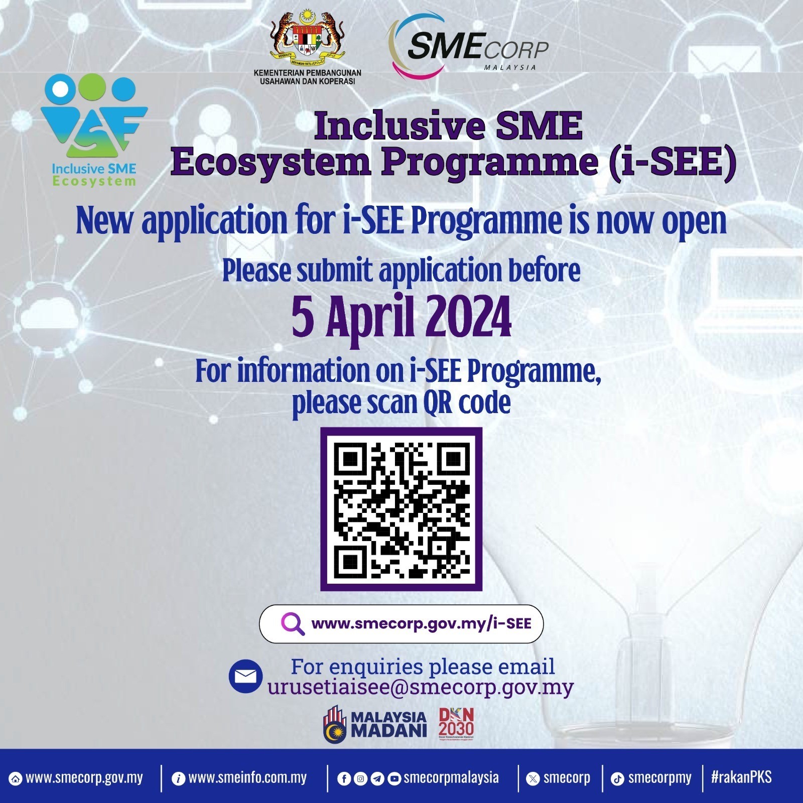 Pihak SME-Corp menawarkan peluang kepada semua yang berminat untuk menyertai Inclusive SME Ecosystem Programme (i-SEE). Maklumat lanjut berkenaan program ini boleh didapati melalui pautan berikut: