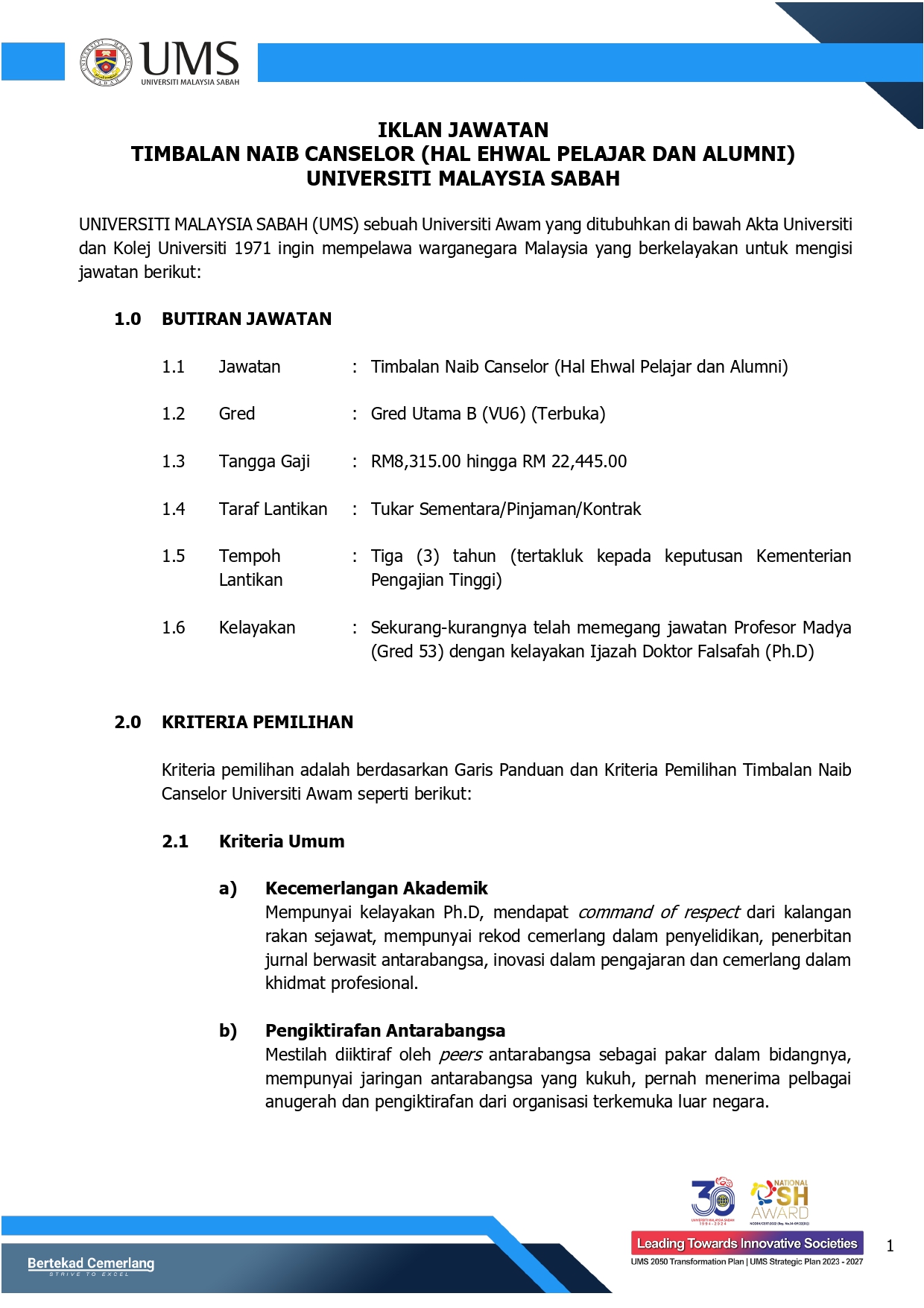 | Iklan Jawatan Timbalan Naib Canselor (Hal Ehwal Pelajar dan Alumni) Universiti Malaysia Sabah | |