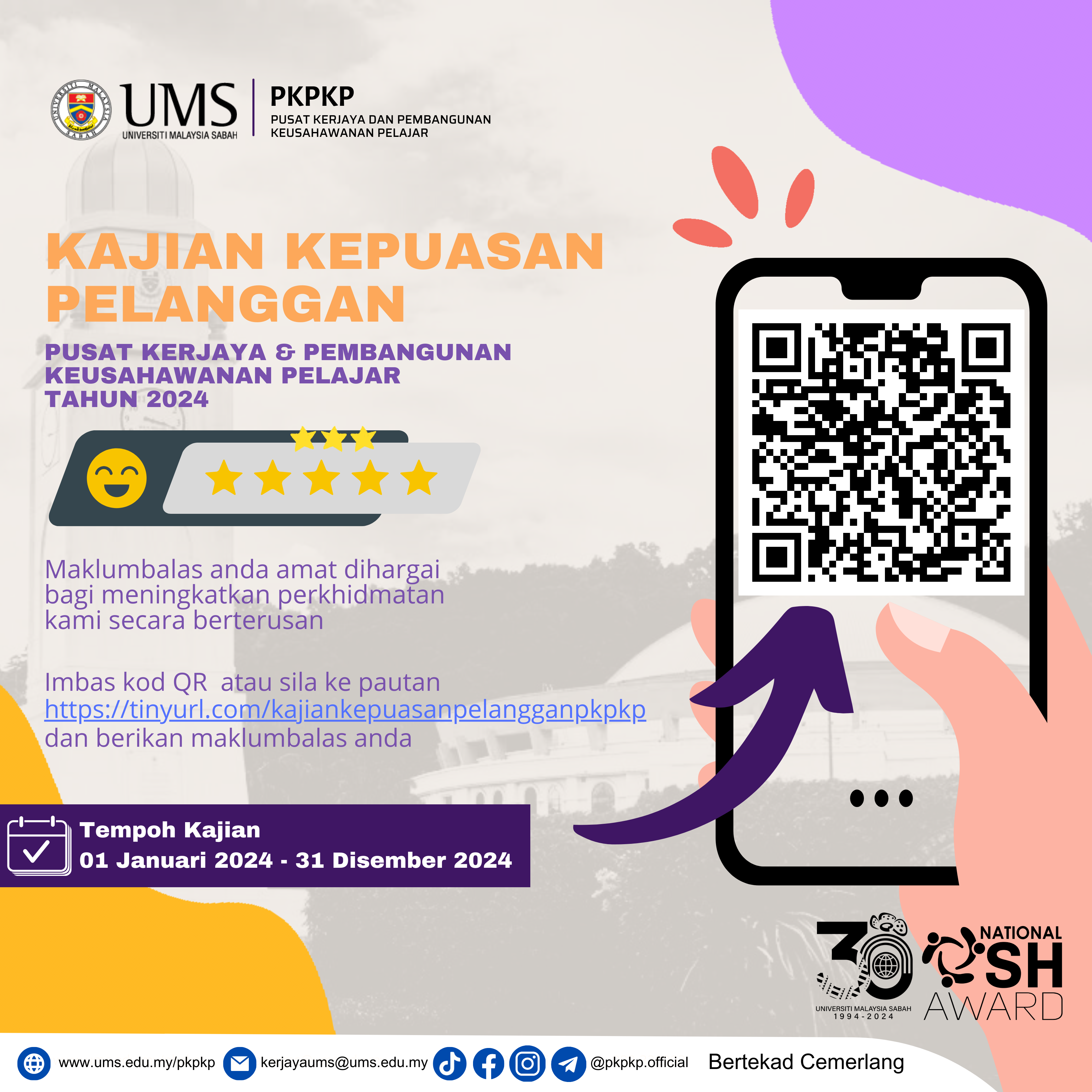 Bagi meningkatkan mutu perkhidmatan kami, mohon kerjasama YBrs. Prof./Dr./Tuan/Puan agar dapat mengisi borang soal selidik Kajian Kepuasan Pelanggan PKPKP melalui imbasan Kod QR yang terdapat pada poster atau melalui pautan https://tinyurl.com/borangkepuasanpelangganpkpkp.
