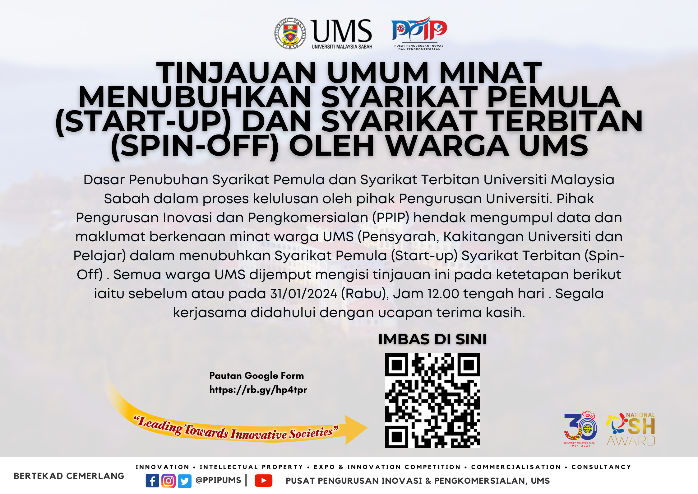 02. Pihak Pusat Pengurusan Inovasi dan Pengkomersialan (PPIP) UMS dalam proses pengumpulan data minat YBhg. Datuk, Dato’, Datin, YBrs. Prof., YBrs. Prof. Madya, YBrs. Dr., Tuan, dan Puan dalam membentuk Syarikat Pemula (Start-up) / Syarikat Terbitan (Spin-Off) UMS, dengan mengisi borang kaji selidik melalui pautan Google Form di bawah: