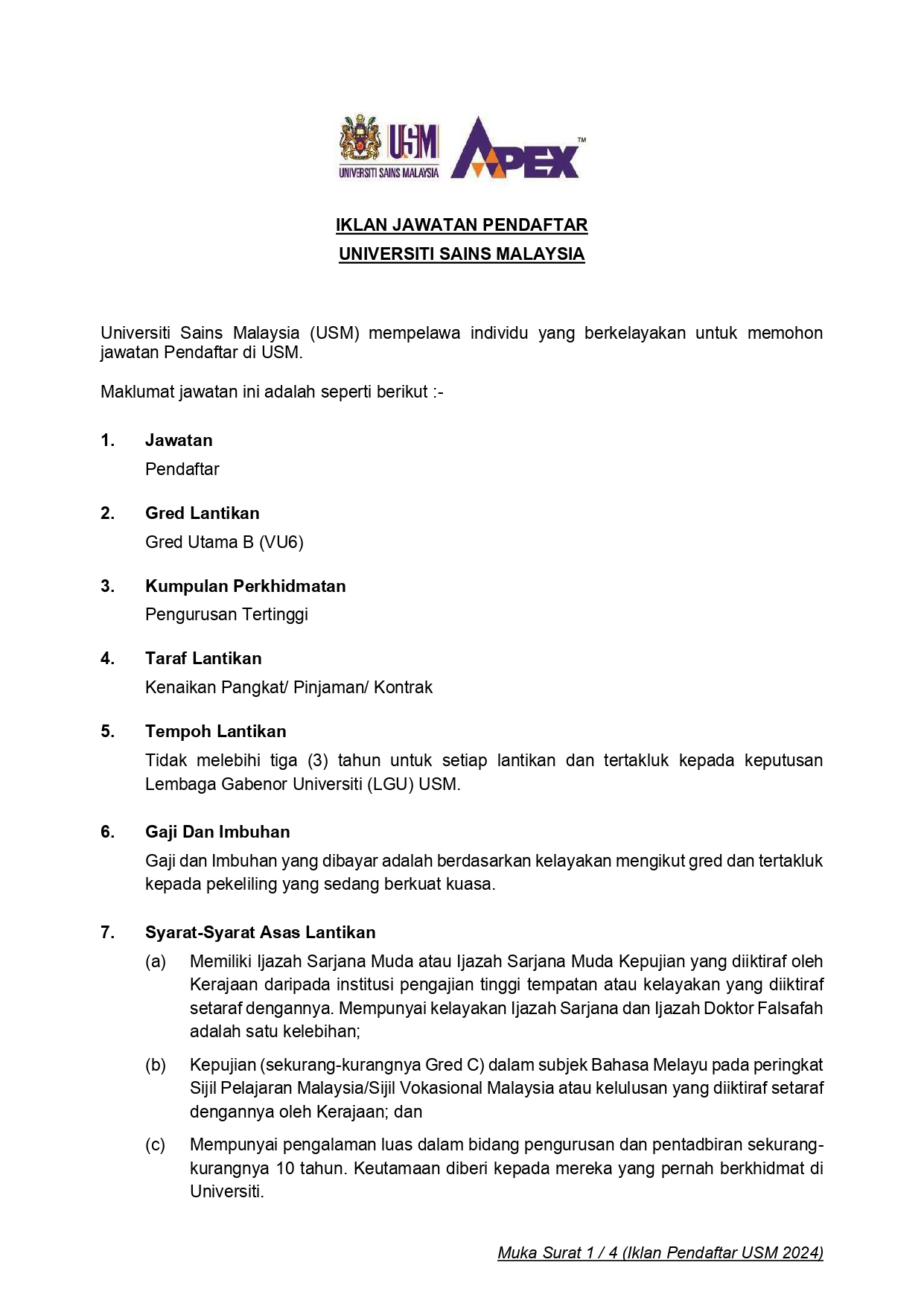 | Iklan Pengisian Jawatan Pendaftar Di Universiti Sains Malaysia | |