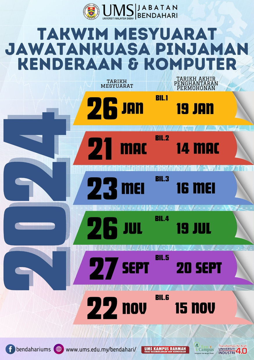 Berikut turut dilampirkan Takwim Mesyuarat Jawatankuasa Pinjaman Kenderaan & Komputer. Kepada yang berminat adalah dialu-alukan untuk mengemukakan borang permohonan mengikut tarikh yang telah ditetapkan.