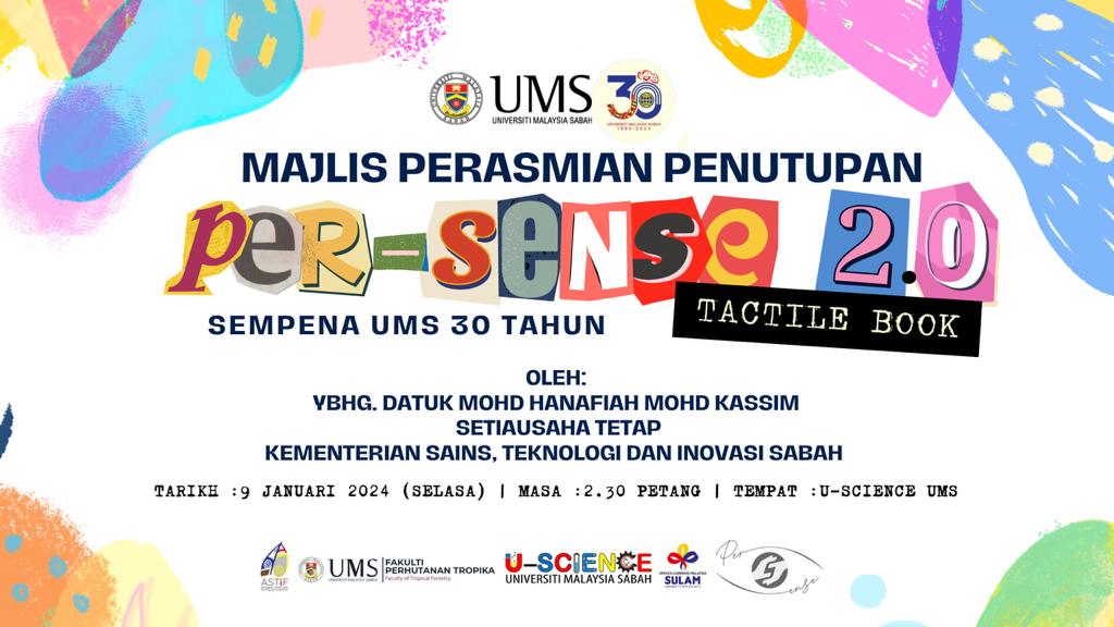 2. Sukacita dimaklumkan bahawa Majlis Perasmian Penutupan Per-SENSE 2.0: Tactile Book Sempena Ulang Tahun Ke-30 Universiti Malaysia Sabah akan diadakan pada ketetapan berikut: