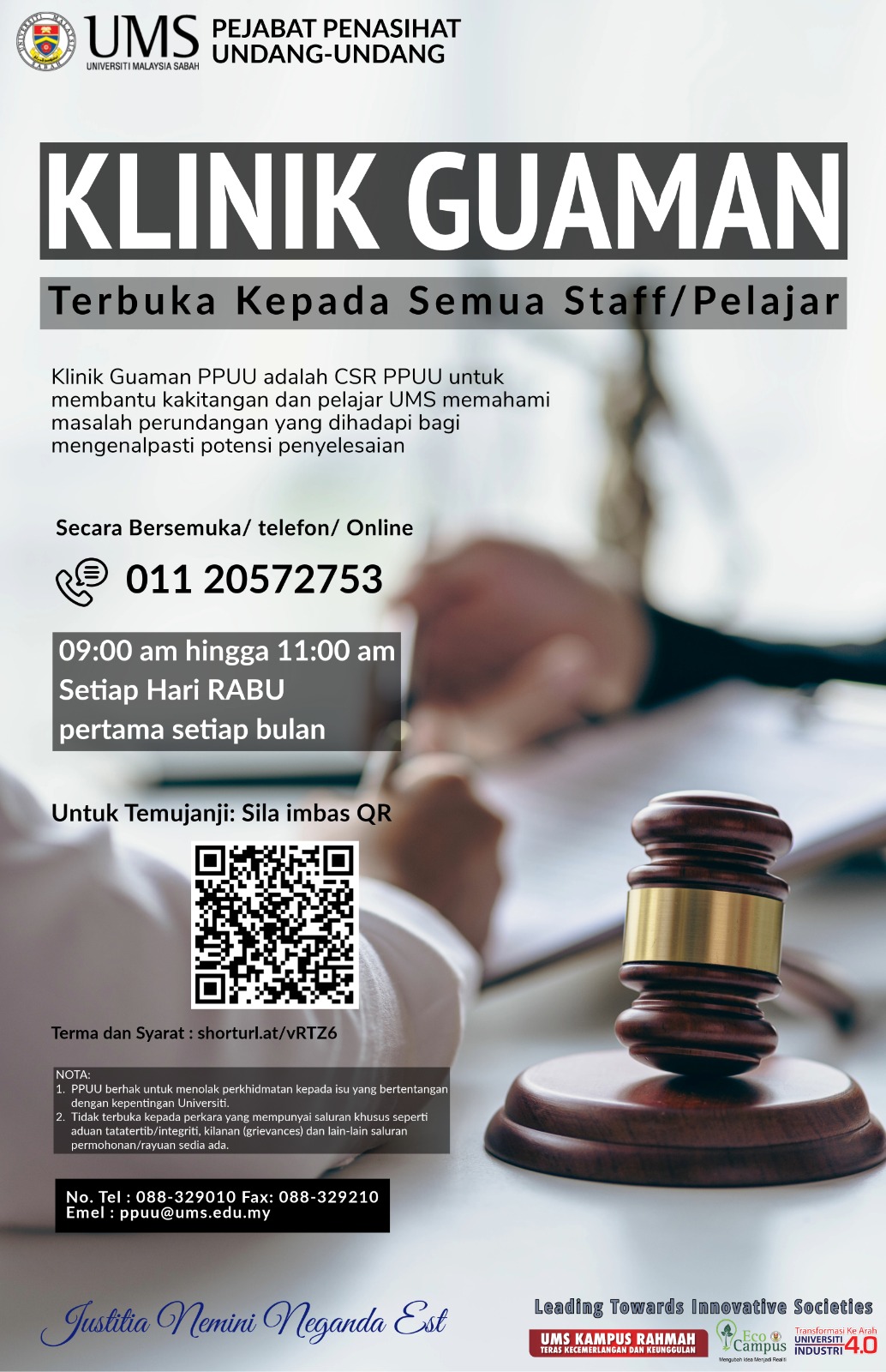 Klinik Guaman adalah CSR PPUU untuk membantu kakitangan dan pelajar UMS memahami masalah perundangan yang dihadapi bagi mengenalpasti potensi penyelesaian.