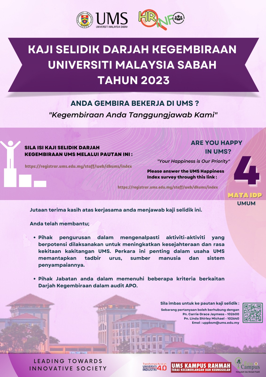 Please answer the UMS Happiness Index survey through this link: https://registrar.ums.edu.my/staff/web/dkums/index (Enter your HrV4 ID click "Kaji Selidik DK-UMS" on your left side menu)