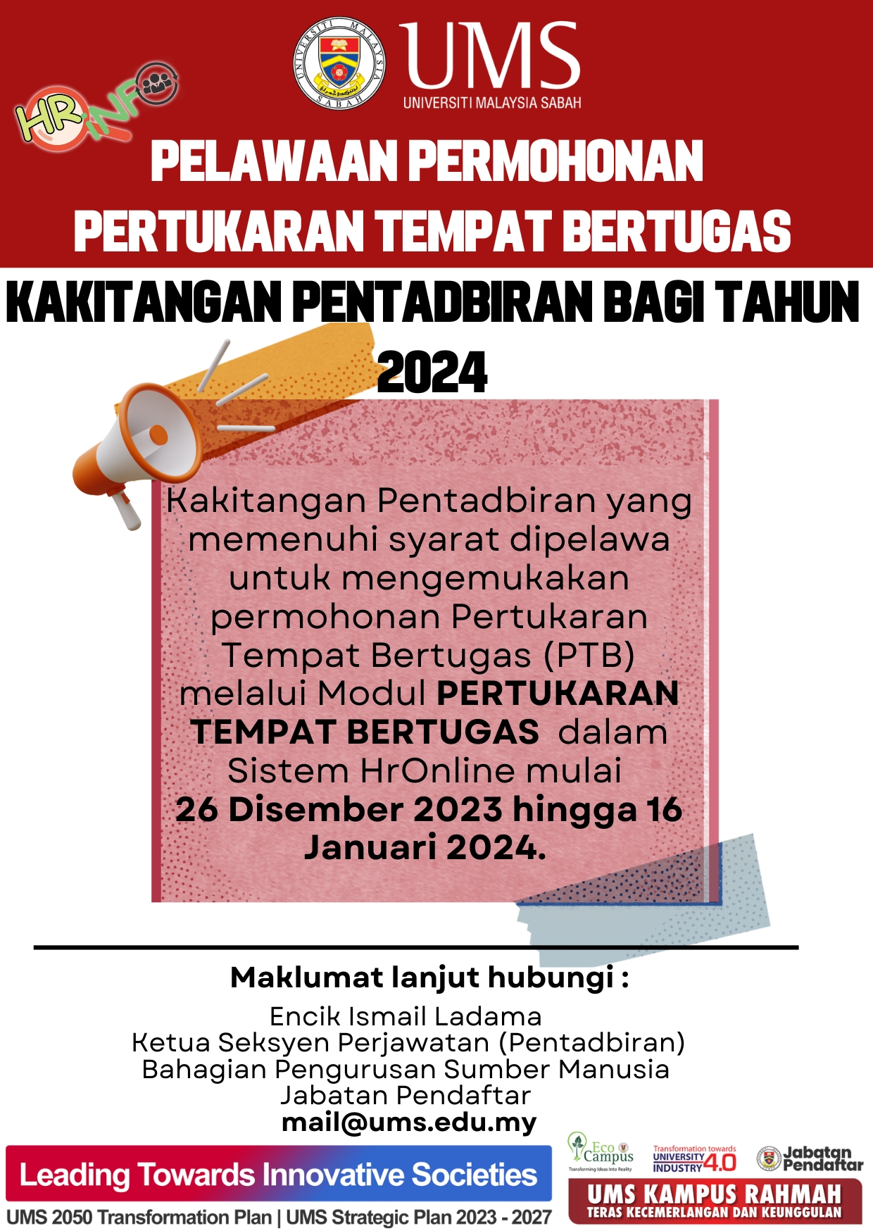 2. Dengan ini dimaklumkan, pihak YBrs. Prof./Dr./Tuan/Puan selaku Ketua Jabatan atau Kakitangan Pentadbiran dipelawa untuk mengemukakan permohonan Pertukaran Tempat Bertugas (PTB) bagi tahun 2024.