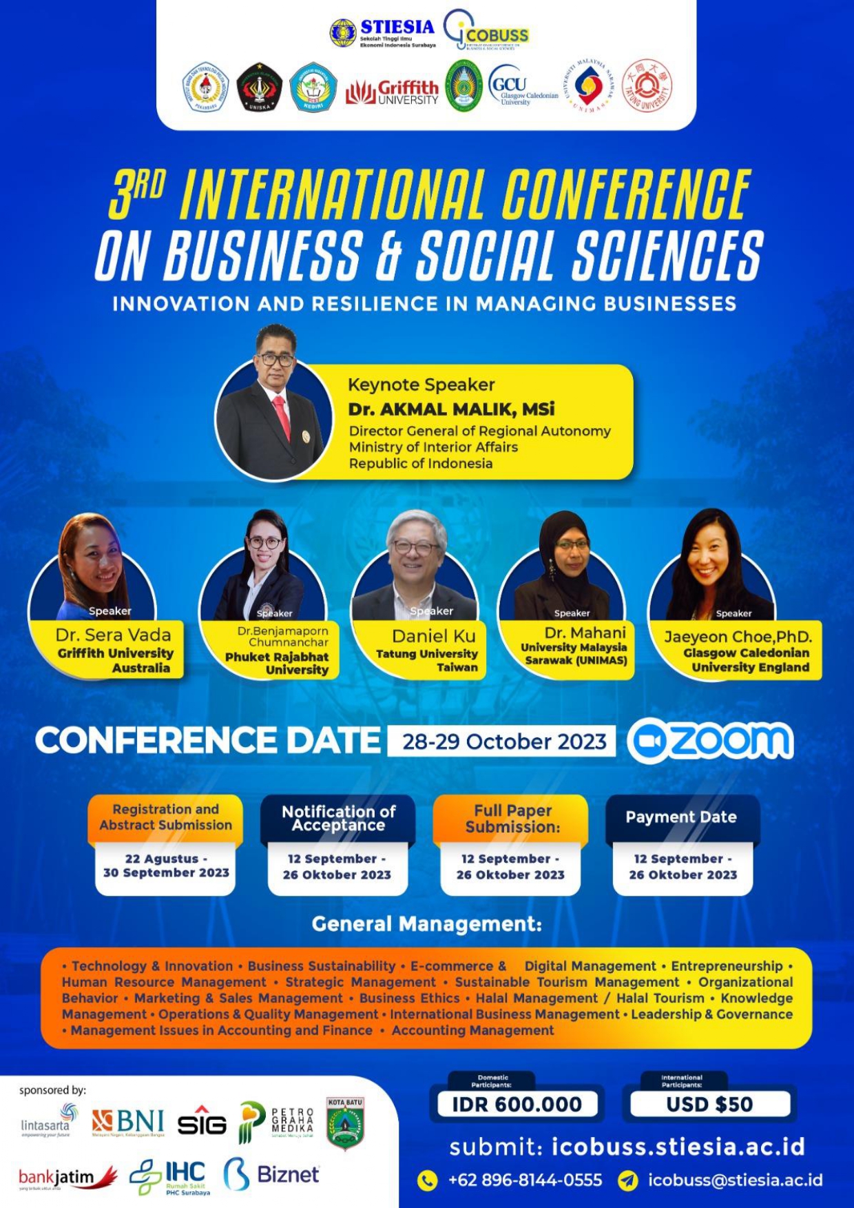 Embracing transformation in Today's Digital Technology: Join our call for submissions on Innovation and Resilience in Managing Business in the event 3rd ICOBUSS (International Conference on Business and Social Sciences) 2023 organized by Sekolah Tinggi Ilmu Ekonomi Indonesia (STIESIA) Surabaya will be held ONLINE by ZOOM on 28-29 October 2023.