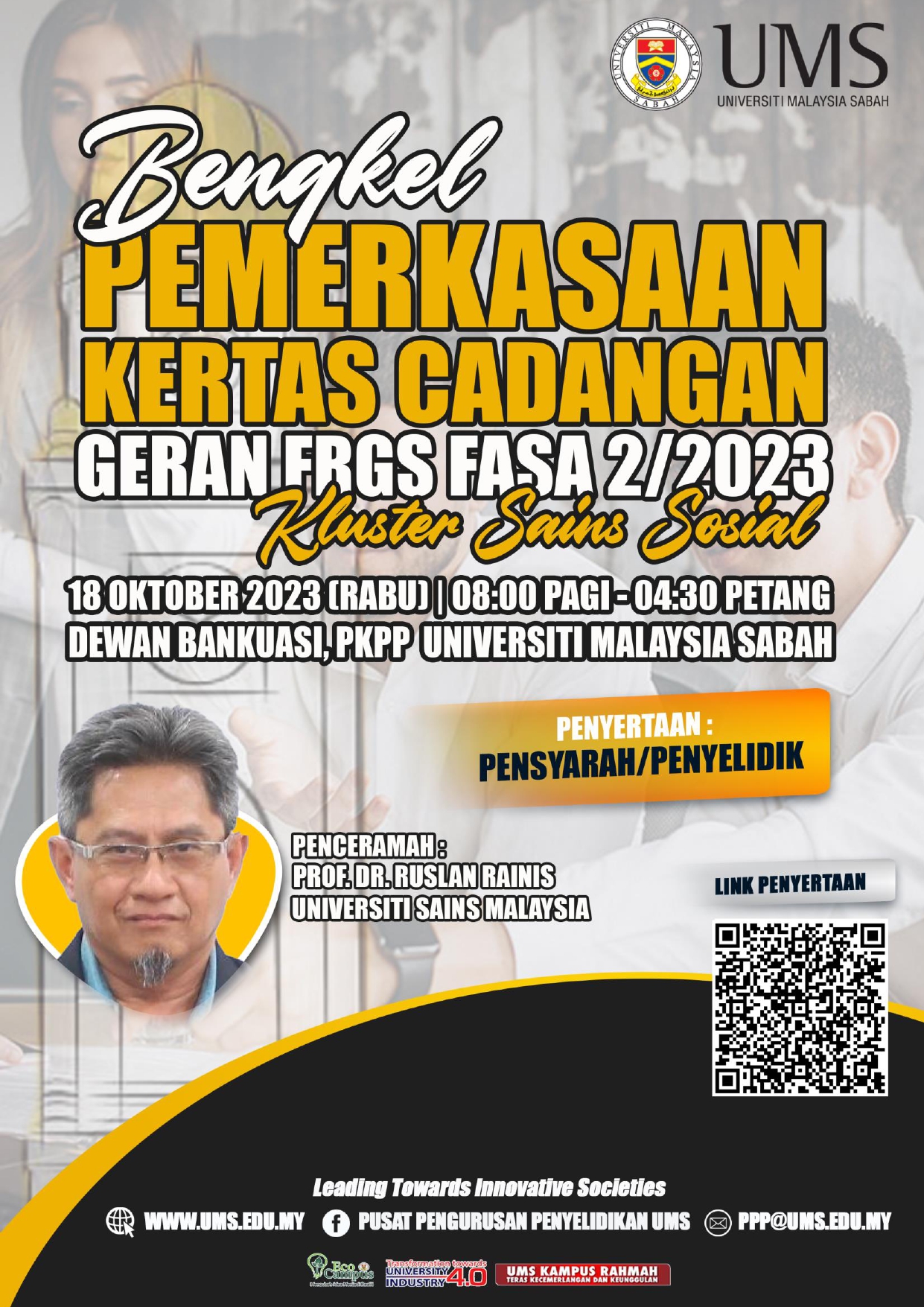Sukacita dimaklumkan Pusat Pengurusan Penyelidikan (PPP) Universiti Malaysia Sabah akan mengadakan Bengkel Pemerkasaan Kertas Cadangan Geran FRGS Fasa 2/2023 Kluster Sains Sosial berdasarkan kepada ketetapan berikut :