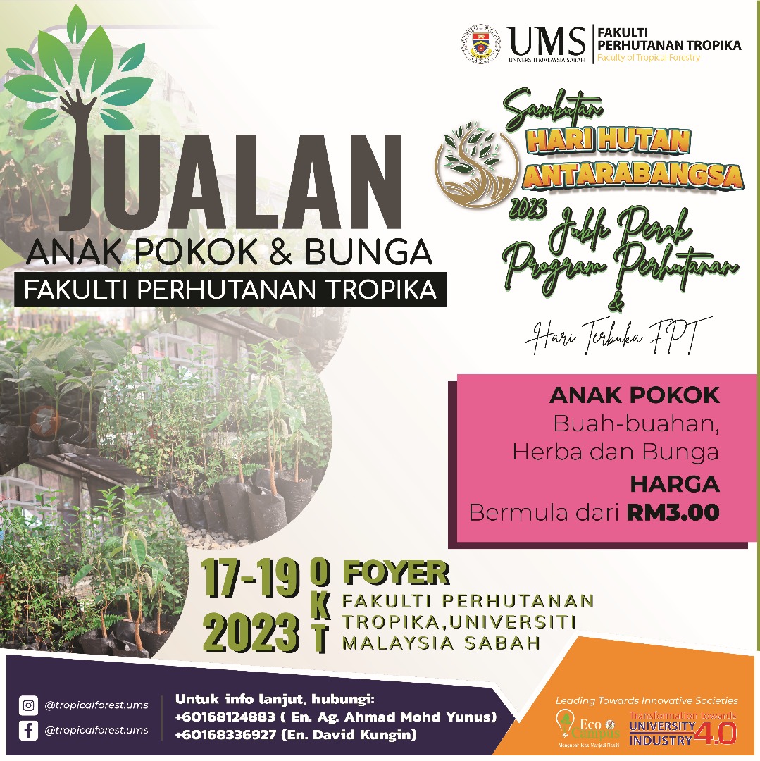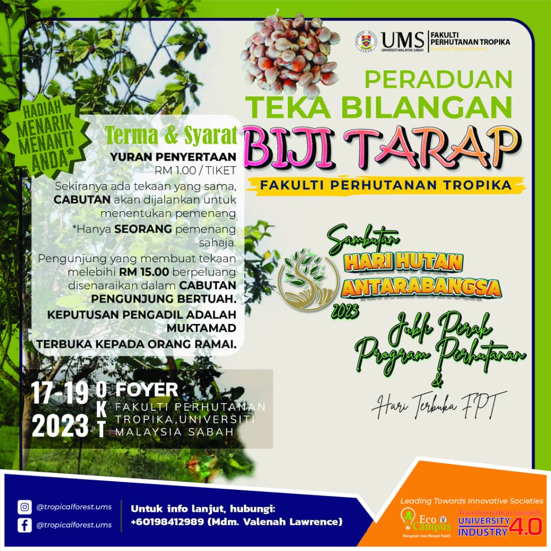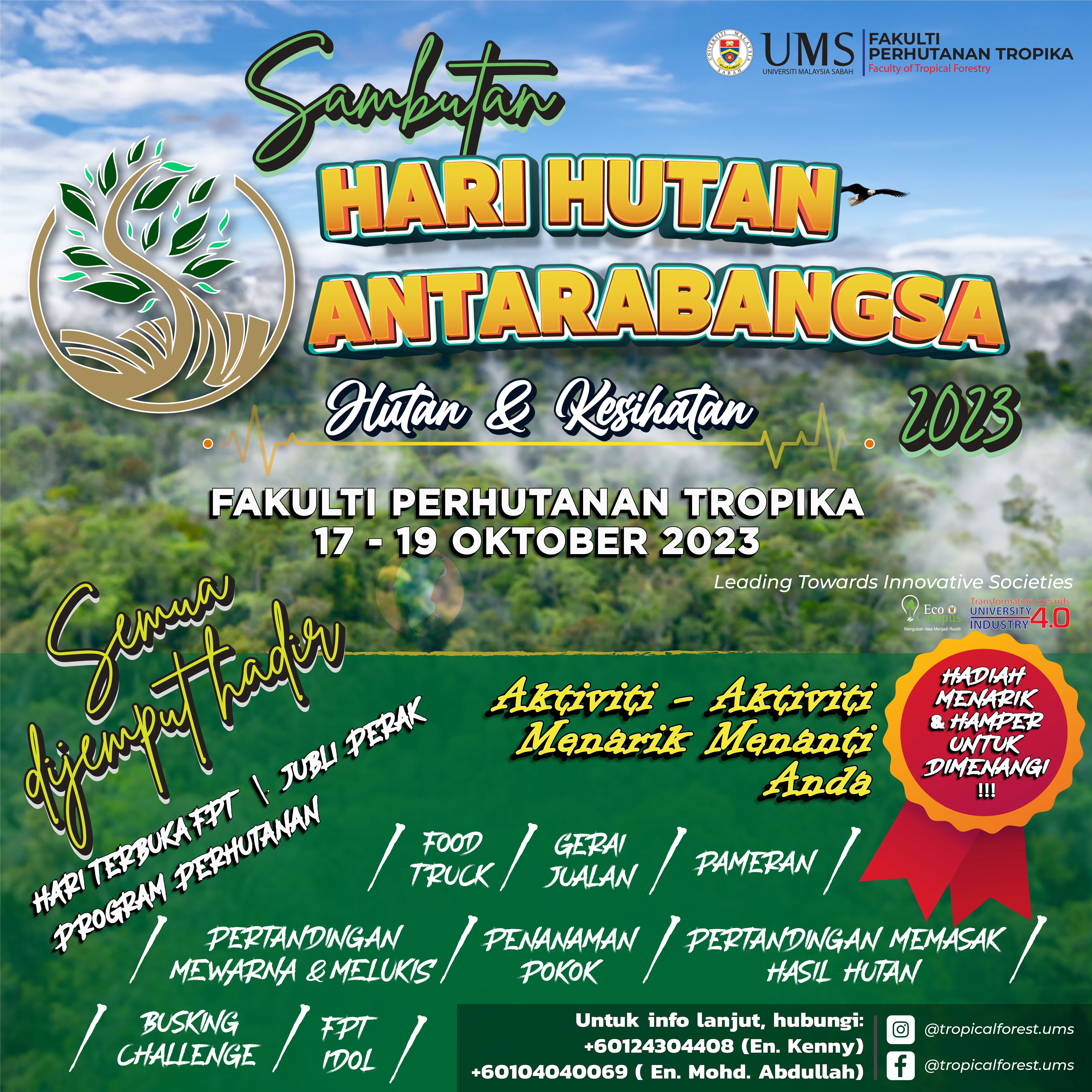 Countdown 1 Hari Lagi Sambutan Hari Hutan Antarabangsa Peringkat UMS anjuran Fakulti Perhutanan Tropika yang akan diadakan pada 17 - 19 Oktober 2023.