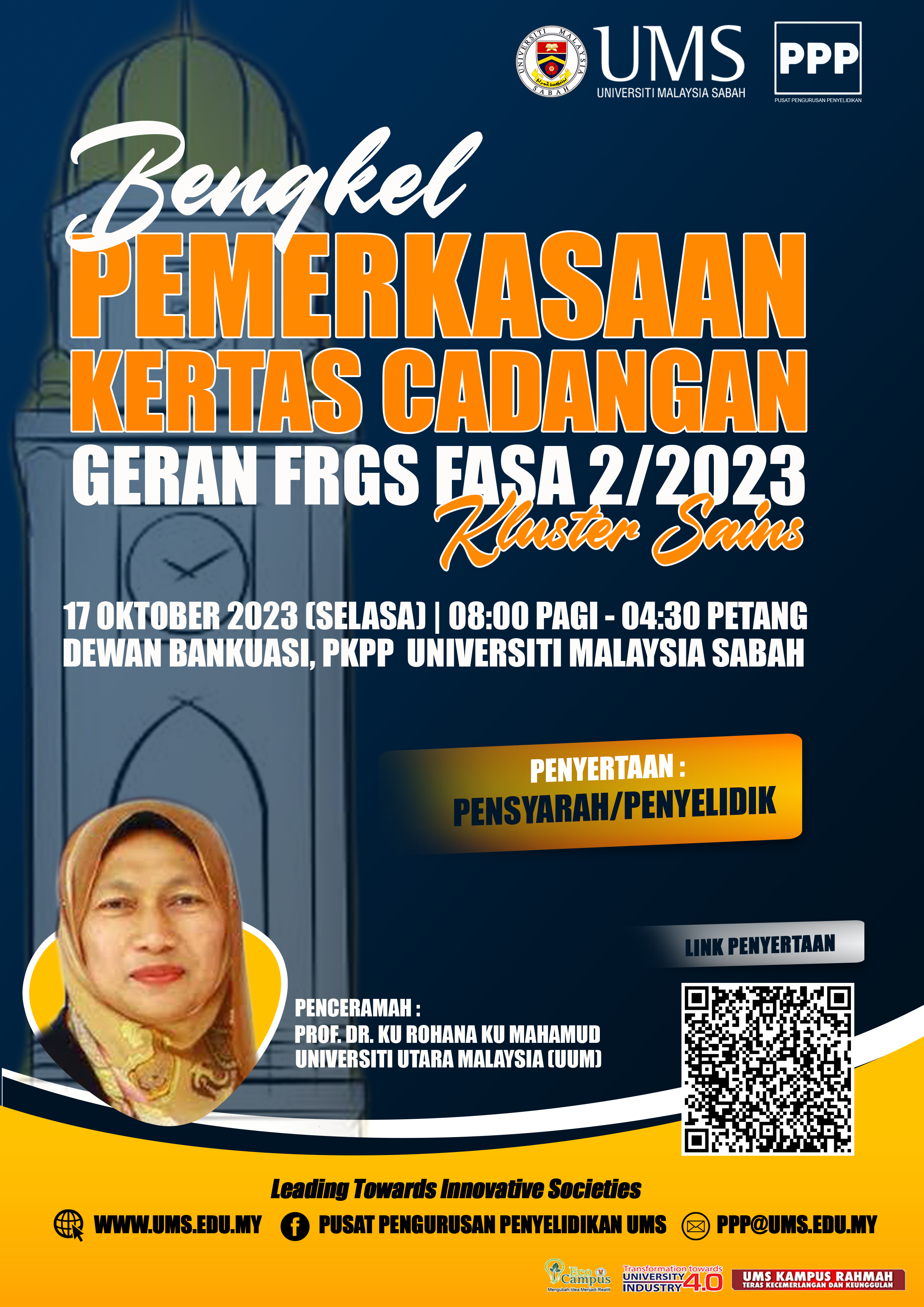 Sukacita dimaklumkan Pusat Pengurusan Penyelidikan (PPP) Universiti Malaysia Sabah akan mengadakan Bengkel Pemerkasaan Kertas Cadangan Geran FRGS Fasa 2/2023 Kluster Sains berdasarkan kepada ketetapan berikut :