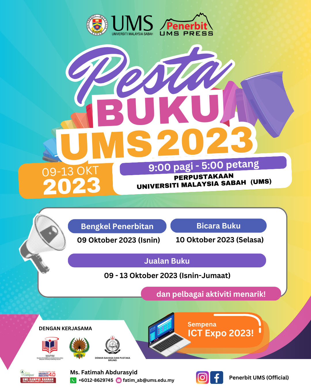 Penerbit UMS dengan kerjasama Dewan Bahasa dan Pustaka (DBP) Sabah akan menganjurkan Pesta Buku UMS 2023 pada 09-13 Oktober 2023 bertempat di Perpustakaan UMS.