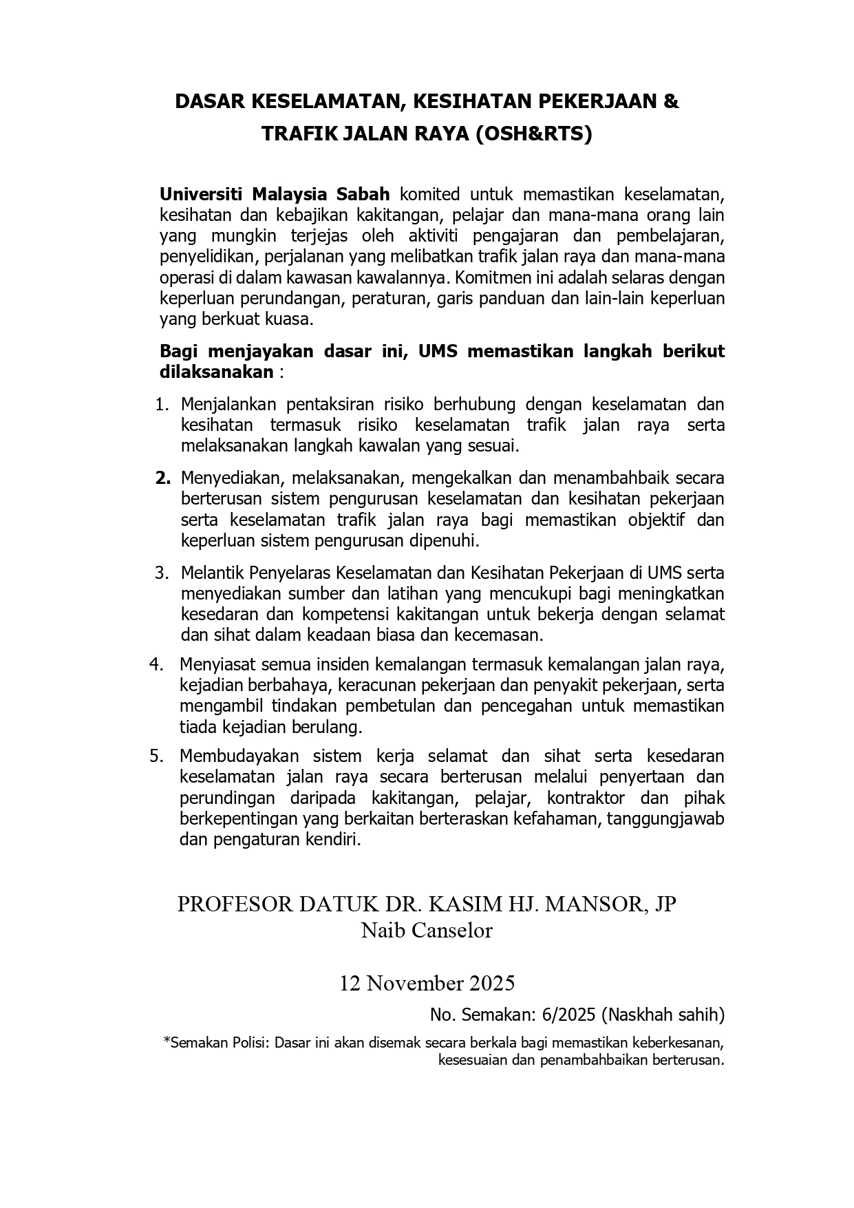 Naib Canselor UMS hasil perbincangan dan perundingan dengan pihak kakitangan dan wakilnya melalui Mesyuarat Jawatankuasa Keselamatan dan Kesihatan Pekerjaan (JKKP-UMS) Bil. 3/2025 pada 12 November 2025 telah bersetuju mengemaskini Dasar KKP (Semakan 5/2022) kepada Dasar OSH&RTS (Semakan 6/2026) yang: