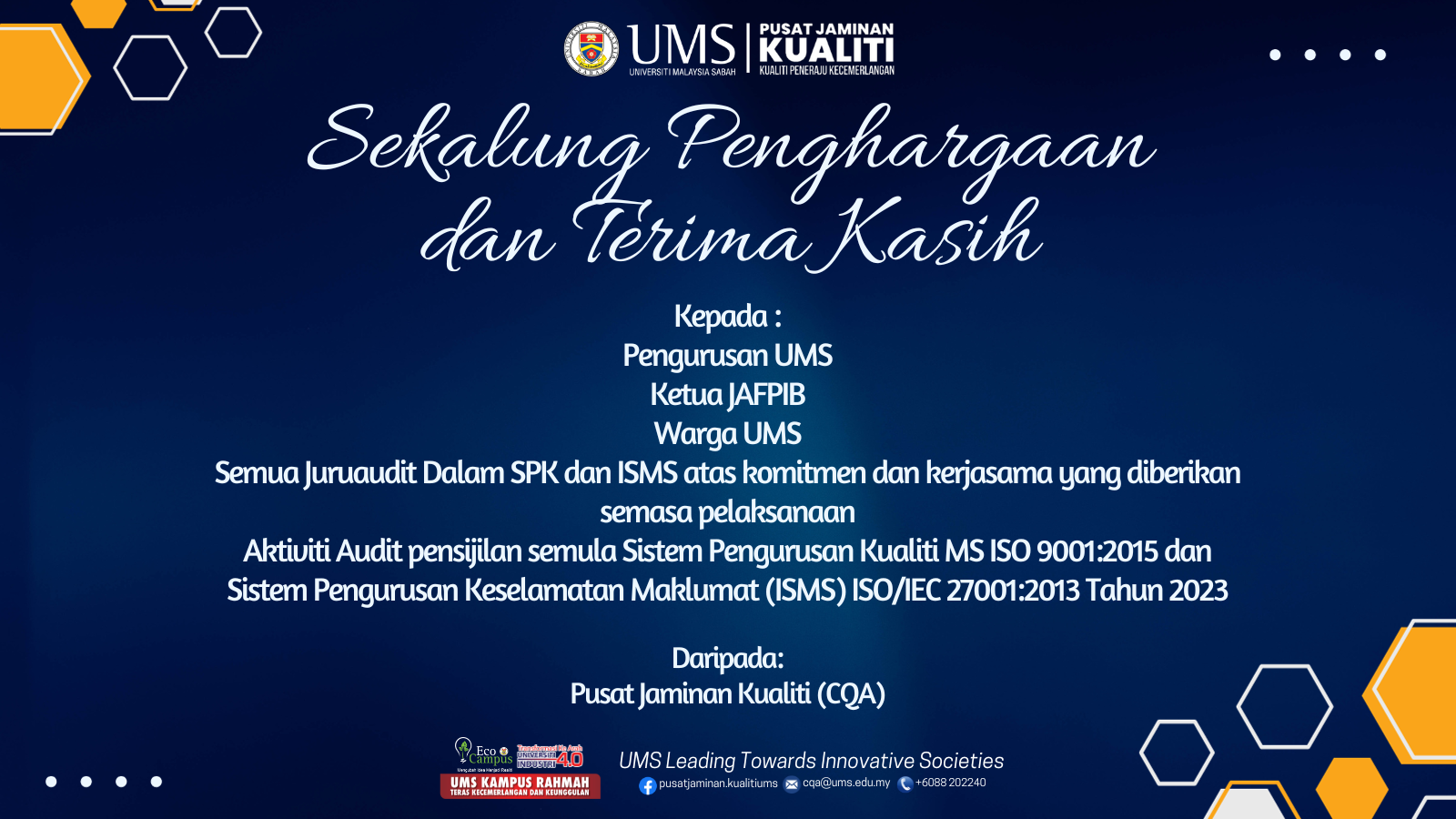 Ucapan Sekalung Penghargaan dan Terima Kasih kepada Pengurusan UMS, Ketua JAFPIB, Warga UMS, semua Juruaudit Dalam SPK dan ISMS atas komitmen dan kerjasama yang diberikan semasa pelaksanaan Aktiviti Audit Pensijilan Semula Sistem Pengurusan Kualiti (SPK) MS ISO 9001:2015 dan Sistem Pengurusan Keselamatan Maklumat (ISMS) ISO/IEC 27001:2013 Tahun 2023 oleh pihak SIRIM QAS pada 11-14 September 2023.
