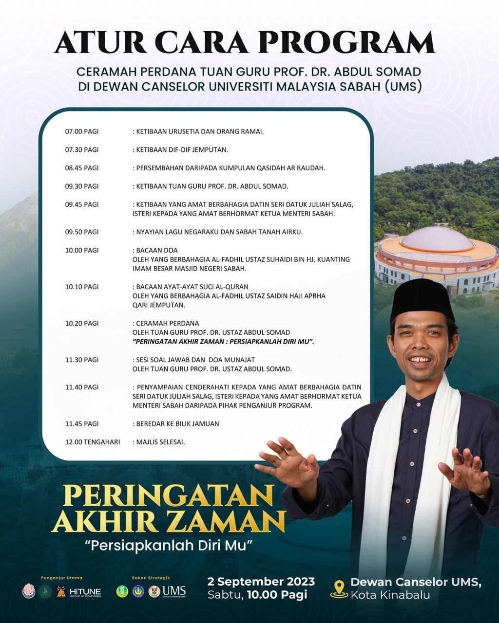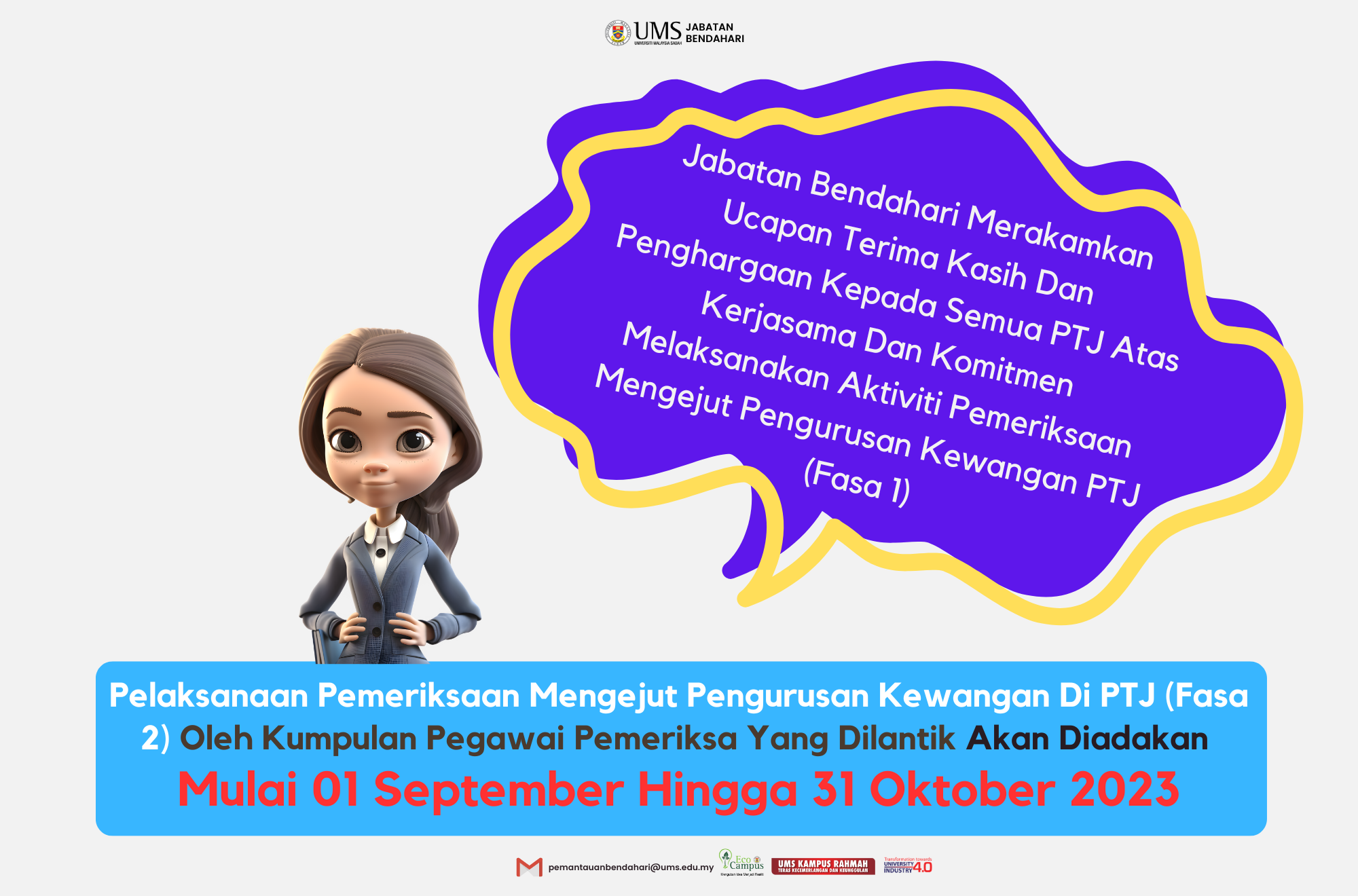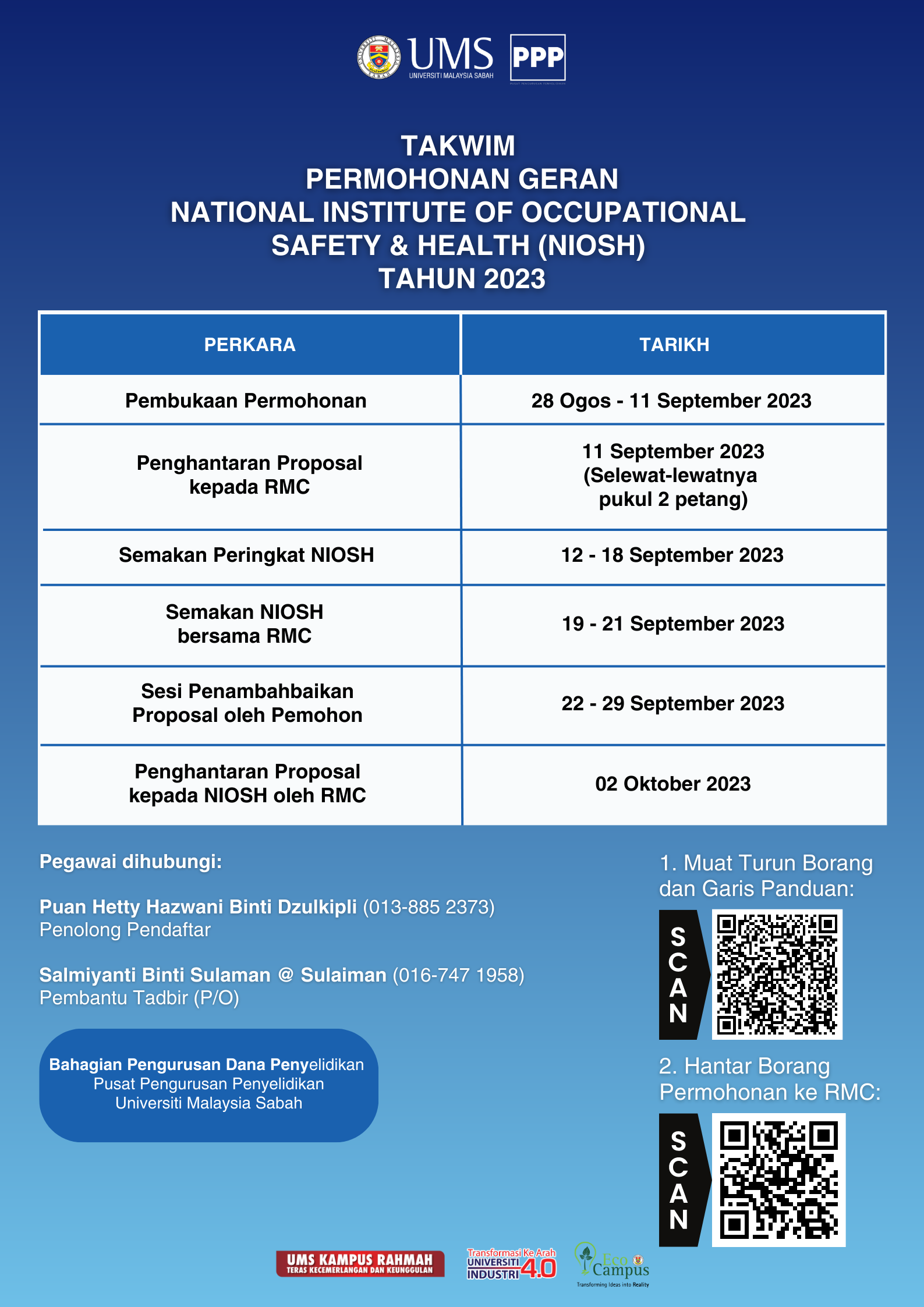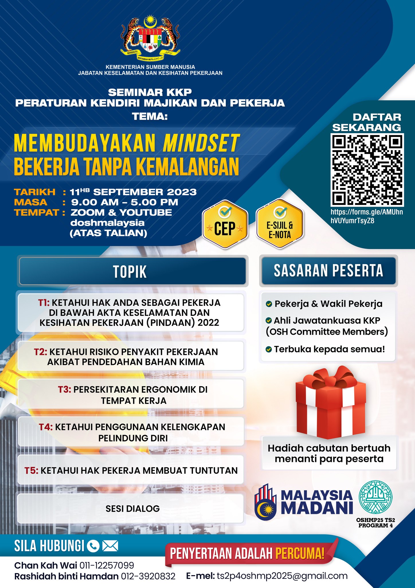 Pihak Pusat Keselamatan dan Kesihatan Pekerjaan, UMS ingin memanjangkan hebahan Seminar Keselamatan dan Kesihatan Pekerjaan (KKP) yang dianjurkan oleh pihak DOSH Malaysia bagi meningkatkan kesedaran dan kefahaman berkaitan tanggungjawab majikan dan pekerja bagi membudayakan mindset bekerja tanpa kemalangan.