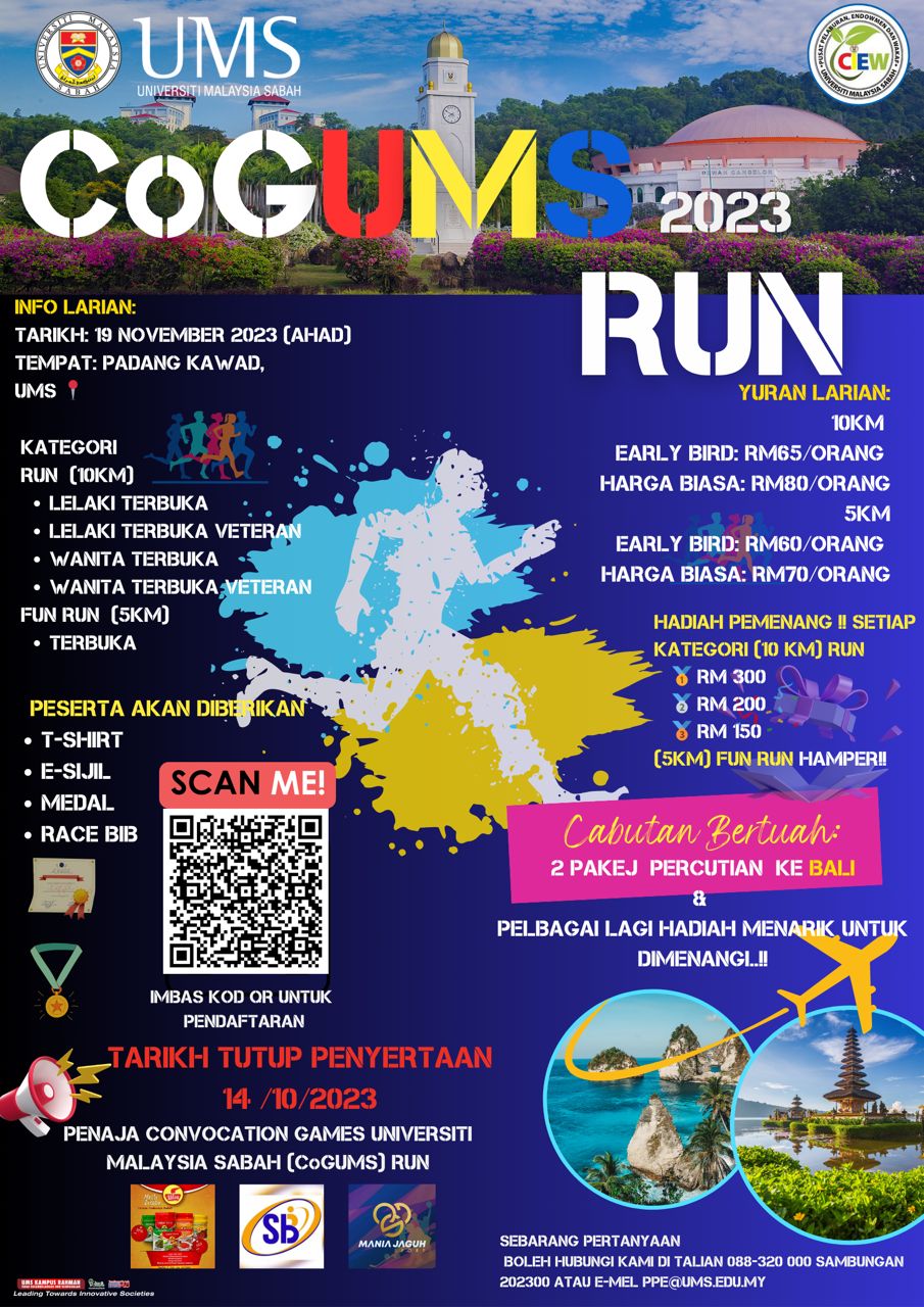 Berita baik untuk semua, jangan lepaskan peluang anda sempena Bulan Konvokesyen UMS Tahun 2023, Pusat Pelaburan Endowmen Dan Wakaf (CIEW) akan menganjurkan satu larian terbuka kepada seluruh warga kakitangan UMS, pelajar dan orang awam.