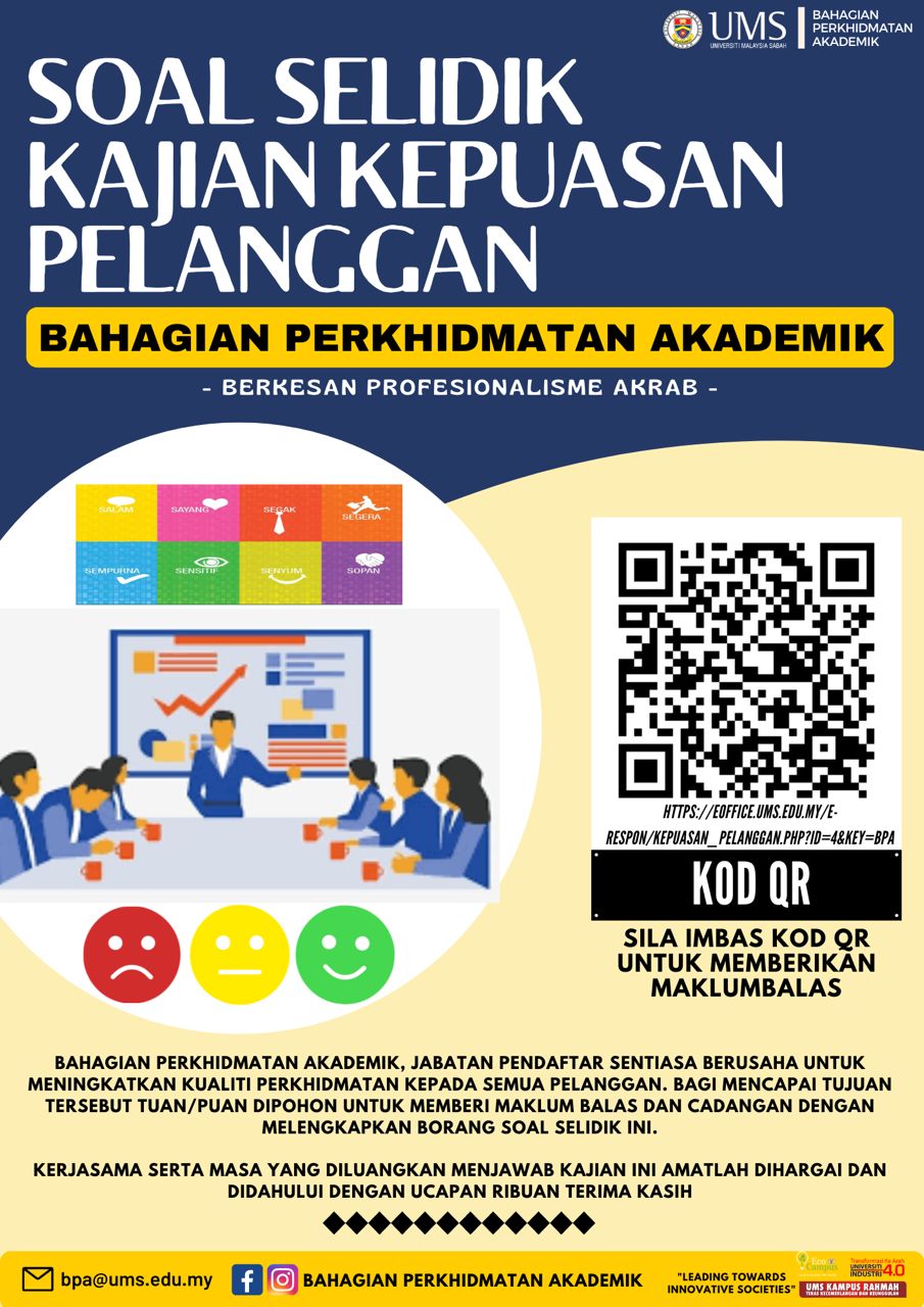 Bagi mencapai tujuan tersebut tuan/puan dipohon untuk memberi maklum balas dan cadangan dengan melengkapkan borang soal selidik di pautan : https://eoffice.ums.edu.my/e-respon/kepuasan_pelanggan.php?id=4&key=BPA