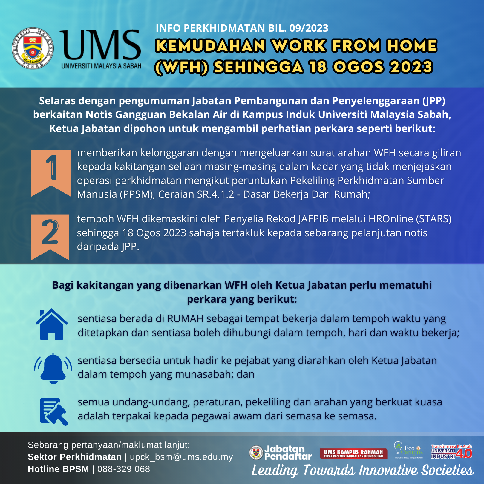 Untuk permohonan dan maklumat lanjut sila layari laman sesawang https://www.ums.edu.my/pkppv2/index.php/ms