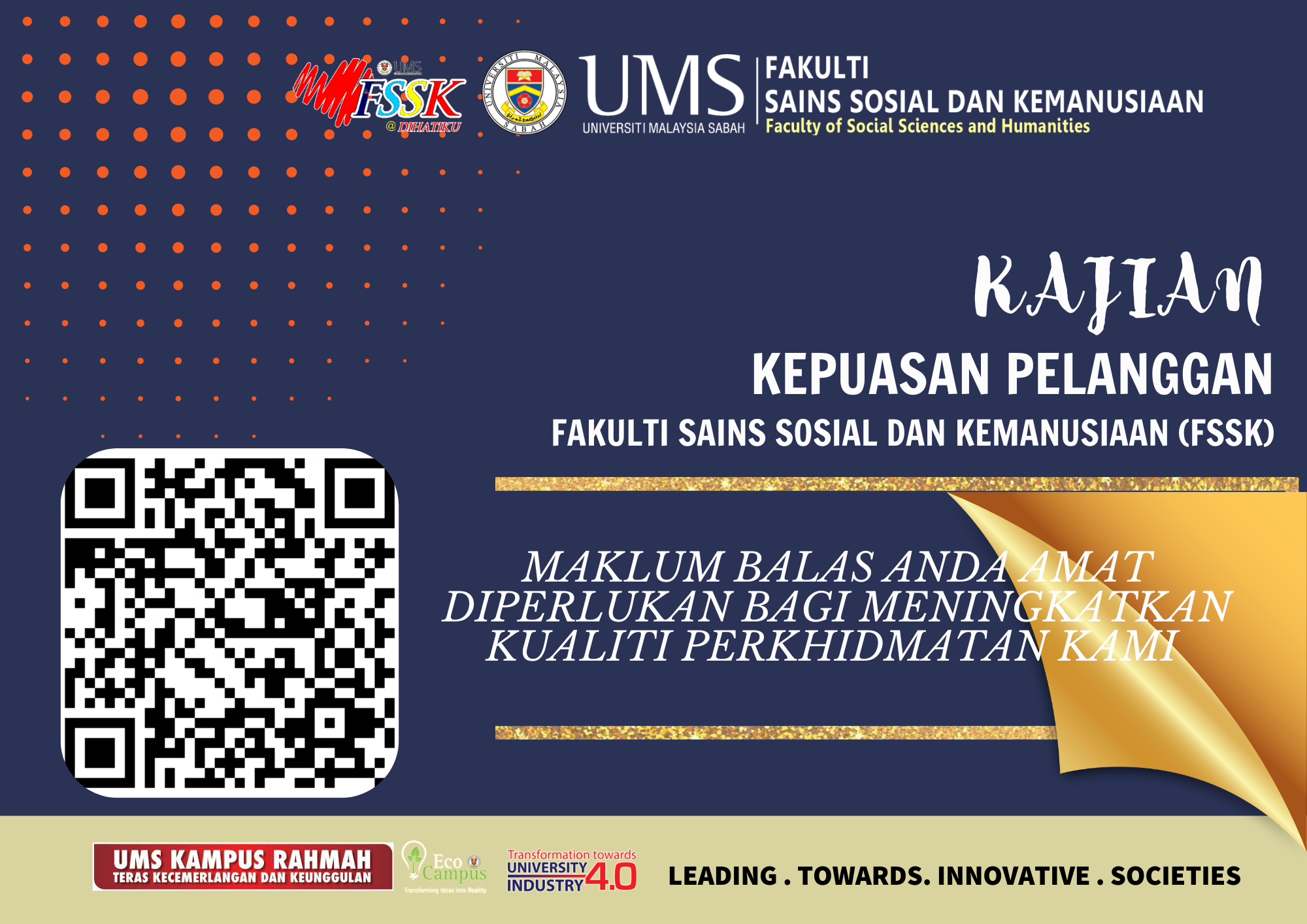 Sukacita dimaklumkan, pihak fakulti memohon jasa baik Prof./Dr./Tuan/Puan untuk mengisi kajian kepuasan pelanggan Fakulti Sains Sosial dan Kemanusiaan (FSSK) bagi tujuan membantu kami menambah baik dan meningkatkan kecekapan serta keberkesanan perkhidmatan kami. Berikut disertakan pautan link: https://eoffice.ums.edu.my/e-respon/kepuasan_pelanggan.php?id=188&key=FSSK