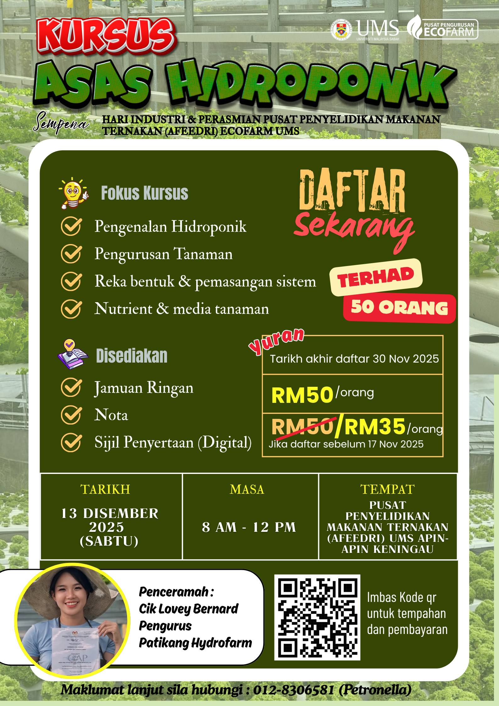 2, | Kursus Asas Hidroponik | 13 Disember 2025 (Sabtu) 8.00 pg – 12.00 tgh | Cik Lovey Bernard Pengurus Patikang Hydrofarm |