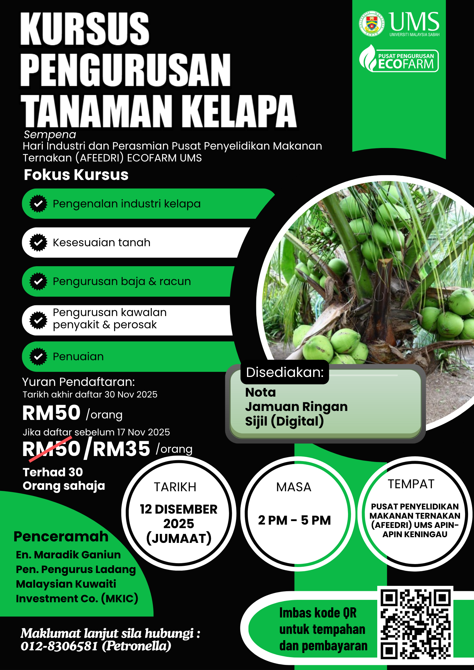 1. | Pengurusan Tanaman Kelapa | 12 Disember 2025 (Jumaat) 2.00 ptg -5.00 ptg | En. Maradik Ganiun Penolong Pengurus Ladang Malaysian Kuwaiti Investment Co. Sdn Bhd (MKIC) |