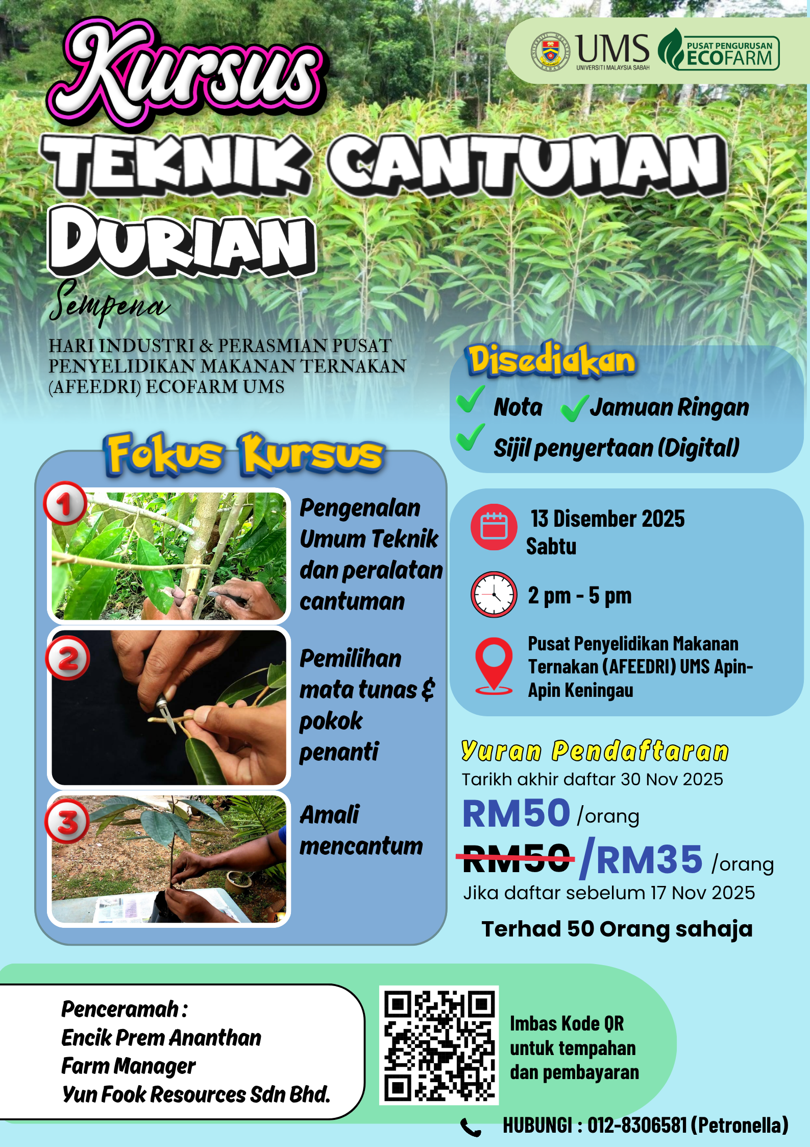 3. | Kursus Teknik Cantuman Durian | 13 Disember 2025 (Sabtu) 2.00 ptg -5.00 ptg | Encik Prem Ananthan Pengurus Ladang Yun Fook Resources Sdn. Bhd (YFR) |