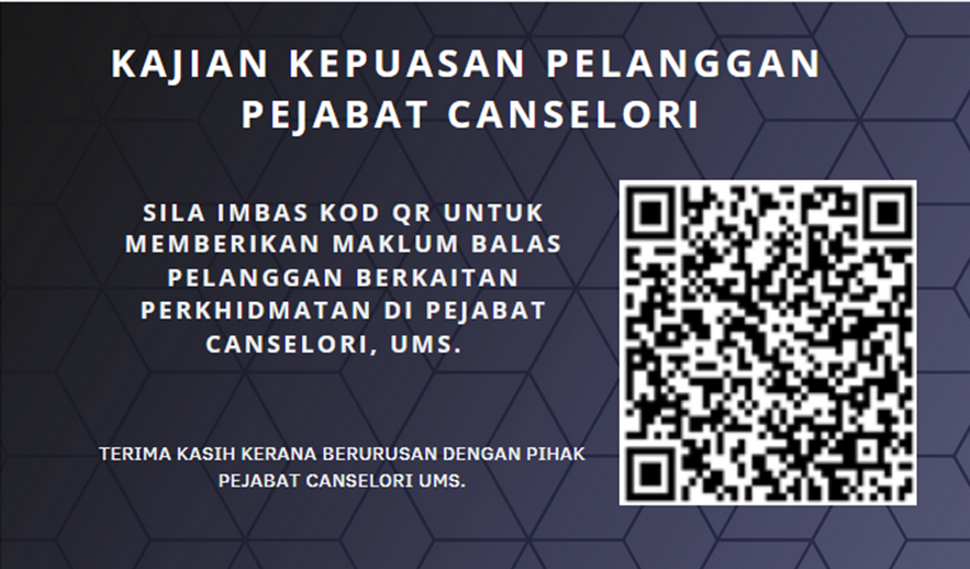 Bagi meningkatkan mutu perkhidmatan kami, mohon kerjasama YBrs. Prof./Dr./Tuan/Puan agar dapat mengisi soal selidik Kajian Kepuasan Pelanggan melalui QR Code tersebut. Maklumbalas anda amat kami hargai.
