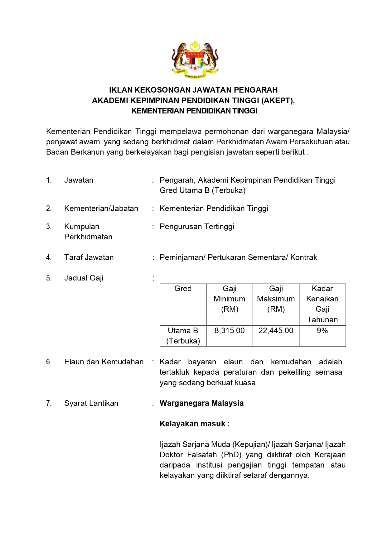 IKLAN KEKOSONGAN JAWATAN PENGARAH DI AKADEMI KEPIMPINAN PENDIDIKAN TINGGI, KEMENTERIAN PENDIDIKAN TINGGI