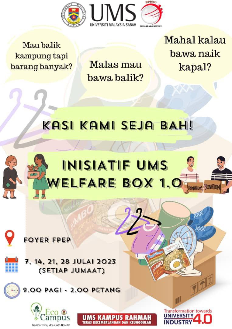 Oleh itu, kami daripada barisan Ahli Jawatankuasa Pelaksana Inisiatif UMS Welfare Box 1.0 mengalu-alukan semua warga UMS yang berminat untuk menyumbang kepada inisiatif ini untuk hadir pada tarikh dan masa yang ditetapkan dan bawa bersama barang-barang yang ingin disumbangkan.