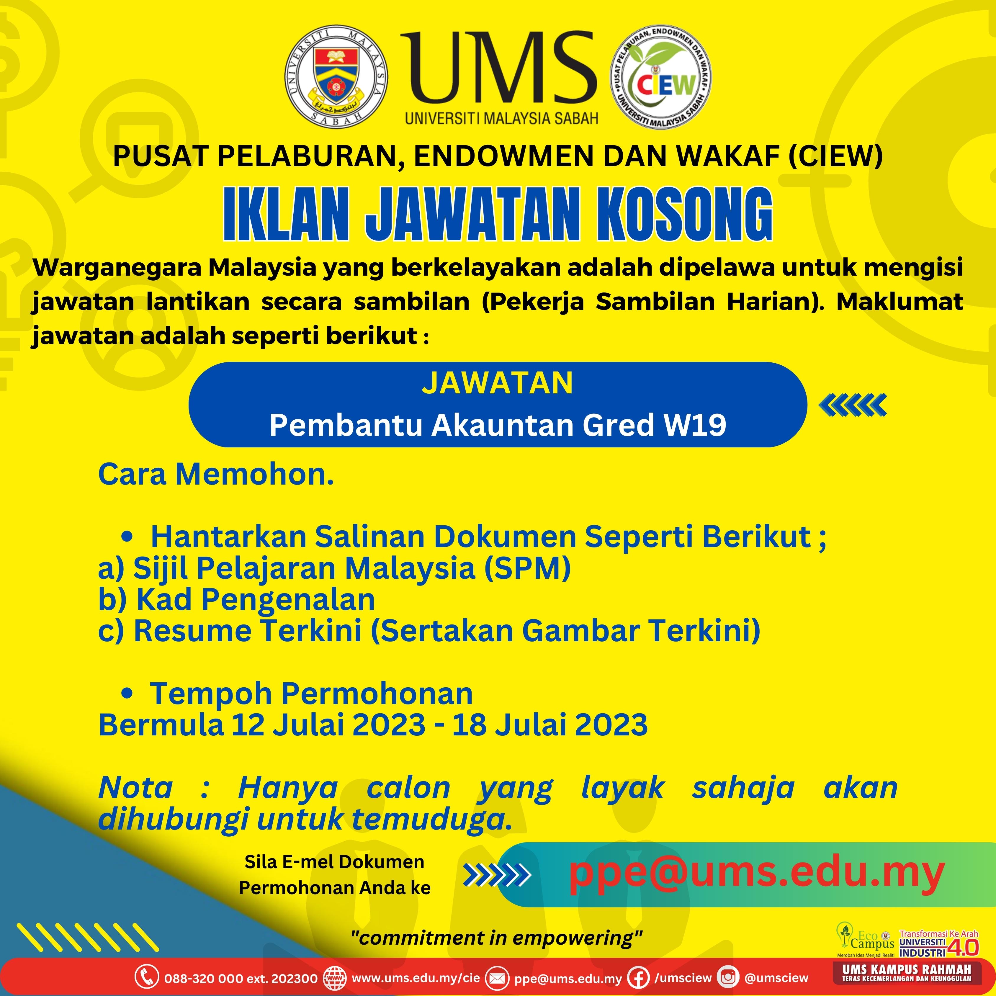 Warganegara Malaysia yang berkelayakan adalah dipelawa untuk mengisi jawatan lantikan secara sambilan (Pekerja Sambilan Harian). Maklumat permohonan sila rujuk poster yang dilampirkan.