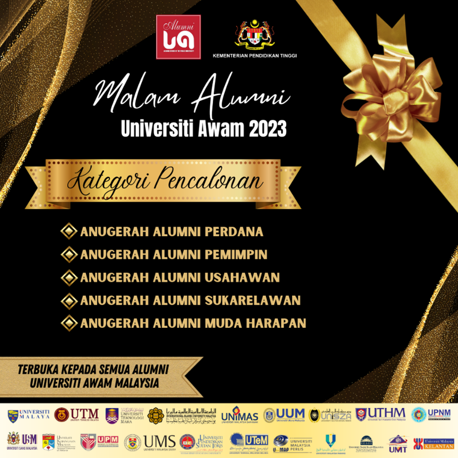 Majlis Alumni Universiti Awam (MAlumni) dengan sukacitanya mempelawa para Alumni Universiti Awam (peringkat Sarjana Muda ke atas) untuk menyertai Anugerah Malam Alumni Universiti Awam (MAL'23) yang penganjurannya akan diadakan pada September 2023.