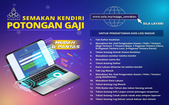 Sehubungan itu, pihak YBhg. Datuk /Datin /YBrs. Prof. /Prof. Madya /Dr. /Tuan /Puan boleh membuat semakan kendiri melalui pautan seperti berikut: http://www.sola.my/espga_semakan