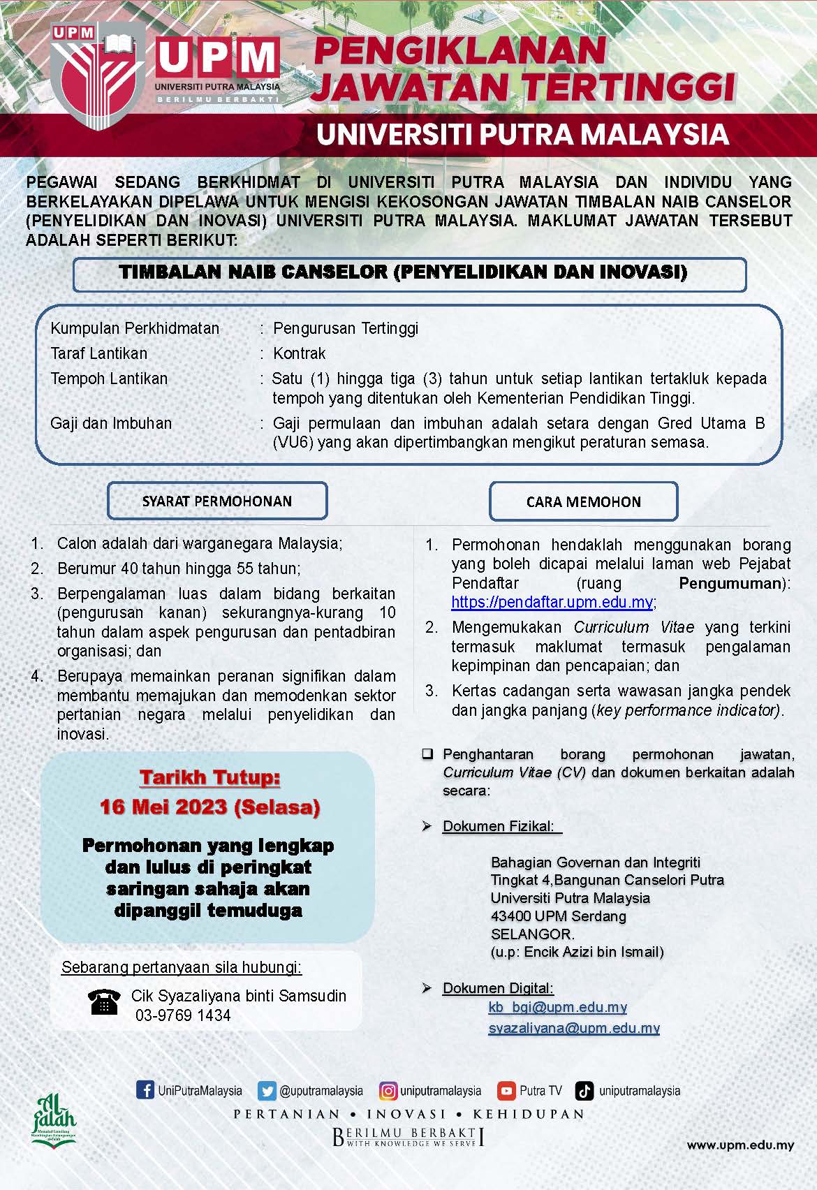 Maklumat lanjut, sila rujuk pautan ini: Pengisian Jawatan Timbalan Naib Canselor (Penyelidikan dan Inovasi) di Universiti Putra Malaysia (UPM)
