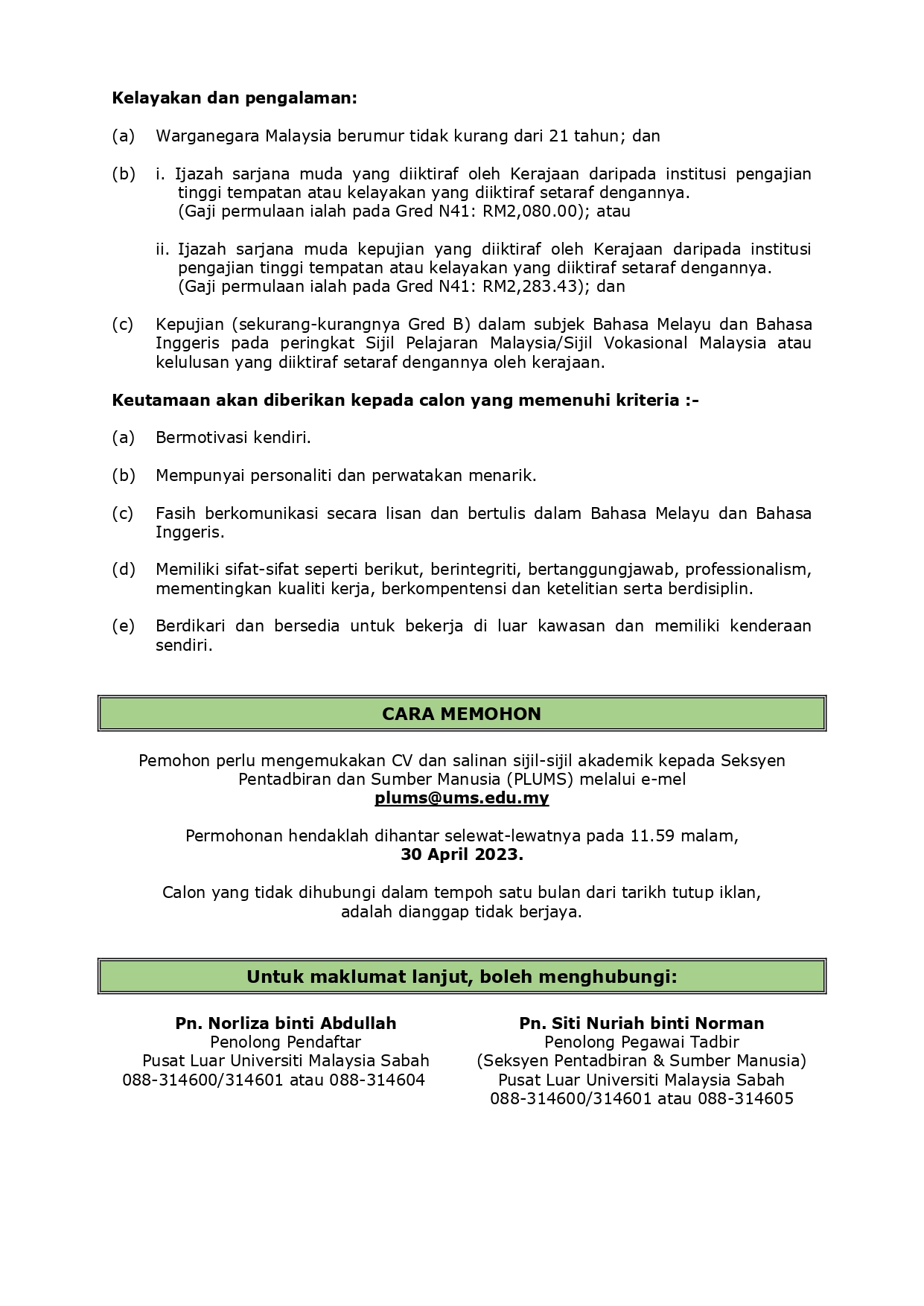 Pertanyaan lanjut boleh hubungi talian 088-320 000 Ext: 202 300 atau Mas Nurhafini binti Sidik di talian 088-320 000 Ext: 202 302.