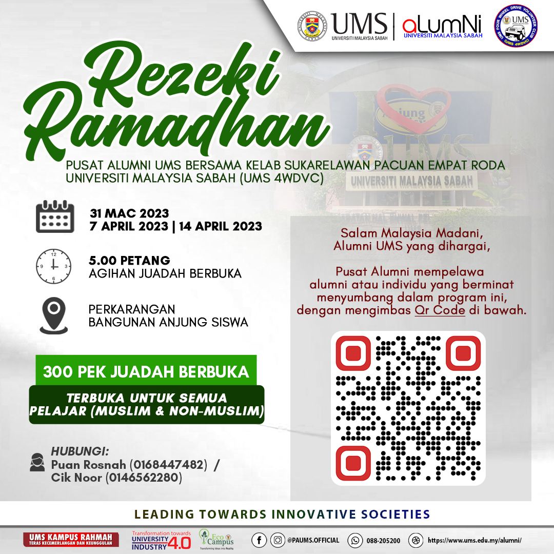 Pusat Alumni dengan kerjasama Kelab 4WD UMS akan menganjurkan Program Rezeki Ramadhan mengikut ketetapan berikut: