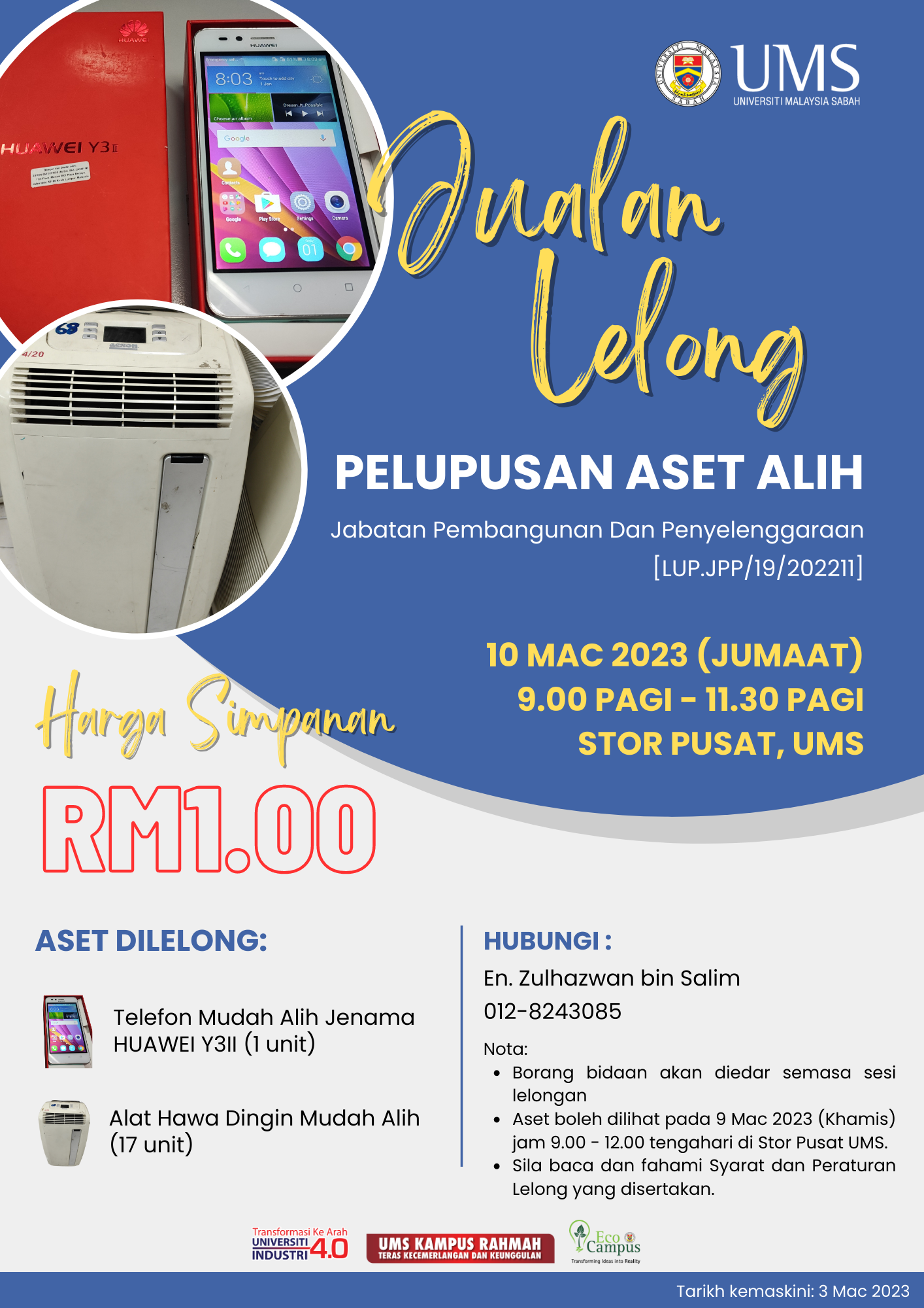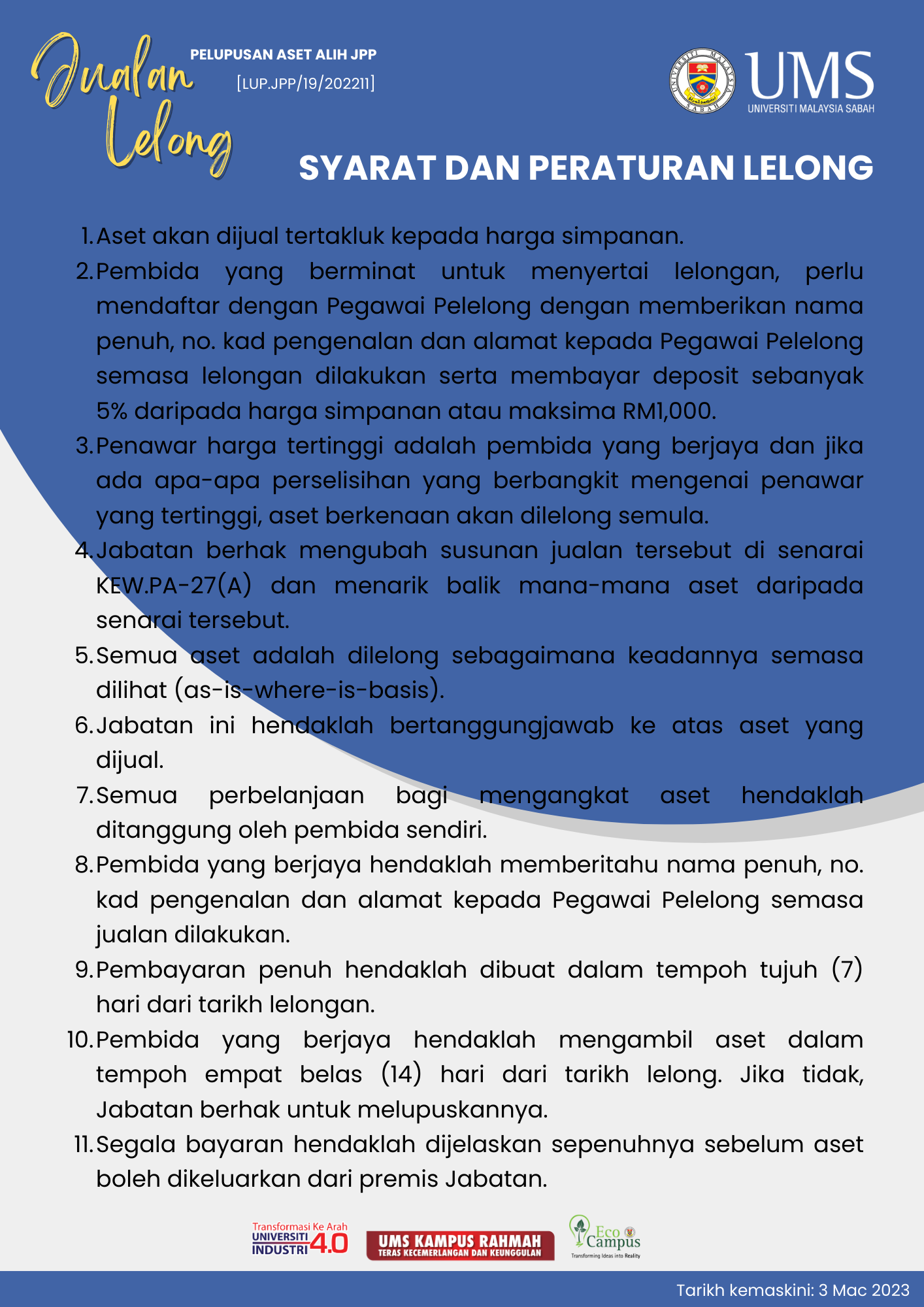 Jualan lelong aset ini adalah terbuka kepada semua kakitangan UMS dan orang awam. Bersama surat ini disertakan Kenyataan Jualan Lelongan Aset Alih (KEW.PA-27 dan KEW.PA-27(A) sebagai rujukan dan hebahan pihak Y.Brs/tuan/puan selanjutnya. Sebarang makluman atau pertanyaan lanjut bolehlah berhubung dengan En. Zulhazwan bin Salim (012-8243085).