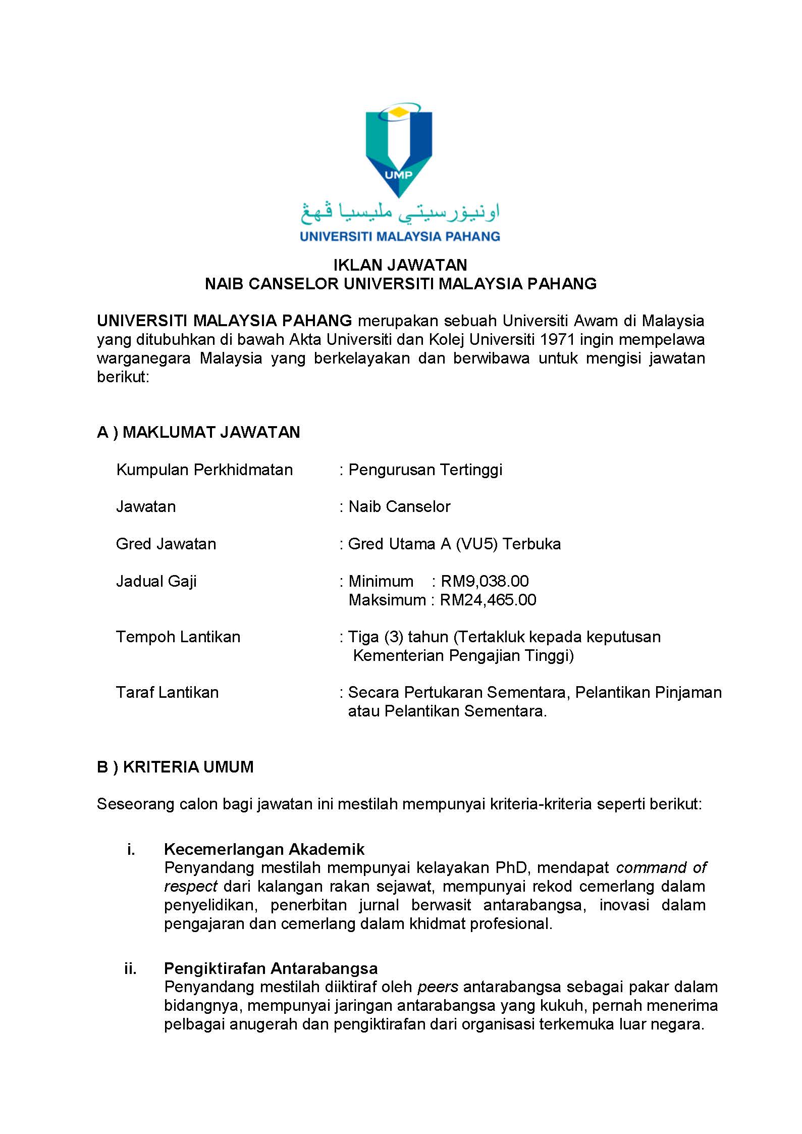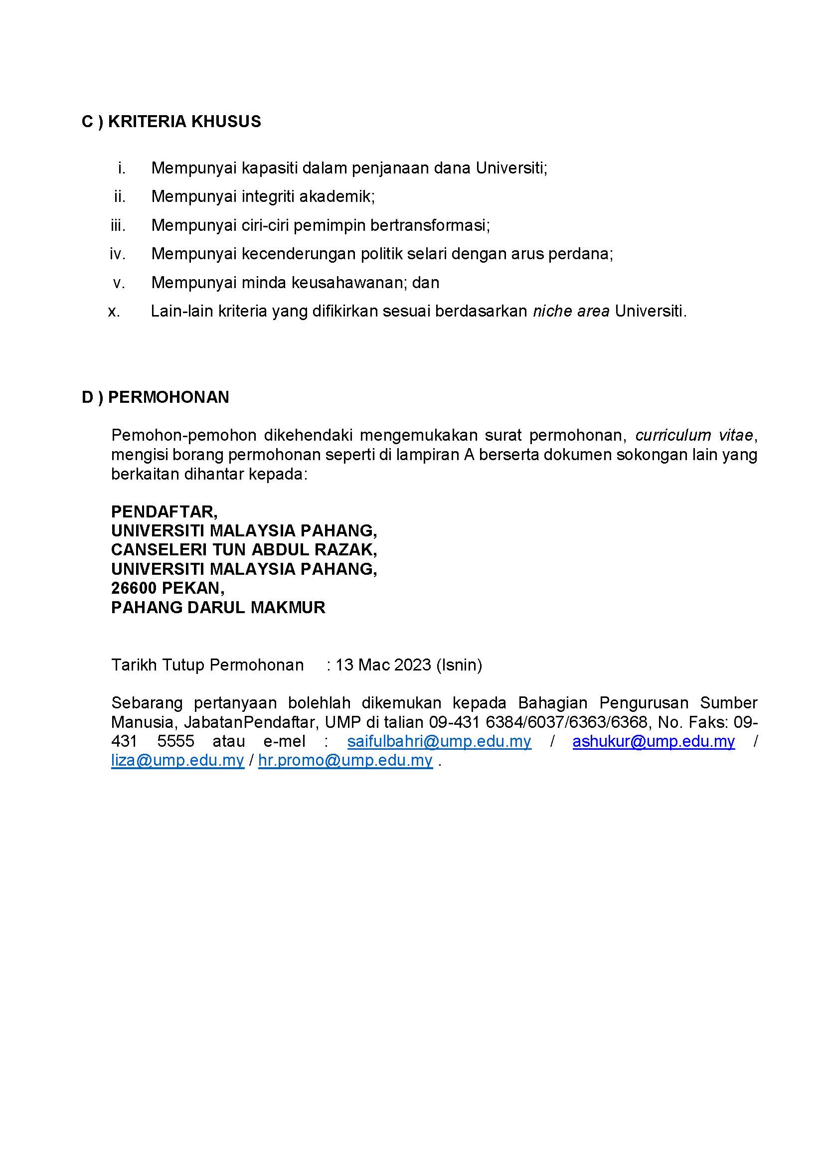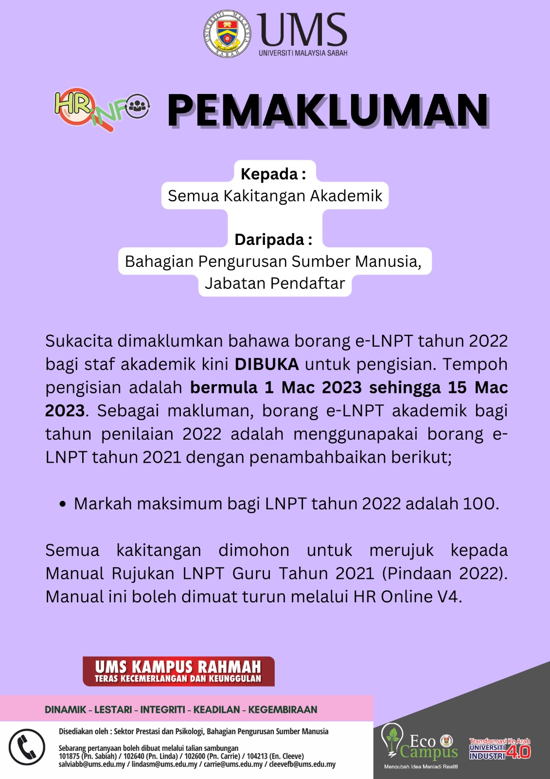 Pengumuman Daripada: Bahagian Pengurusan Sumber Manusia, Jabatan Pendaftar