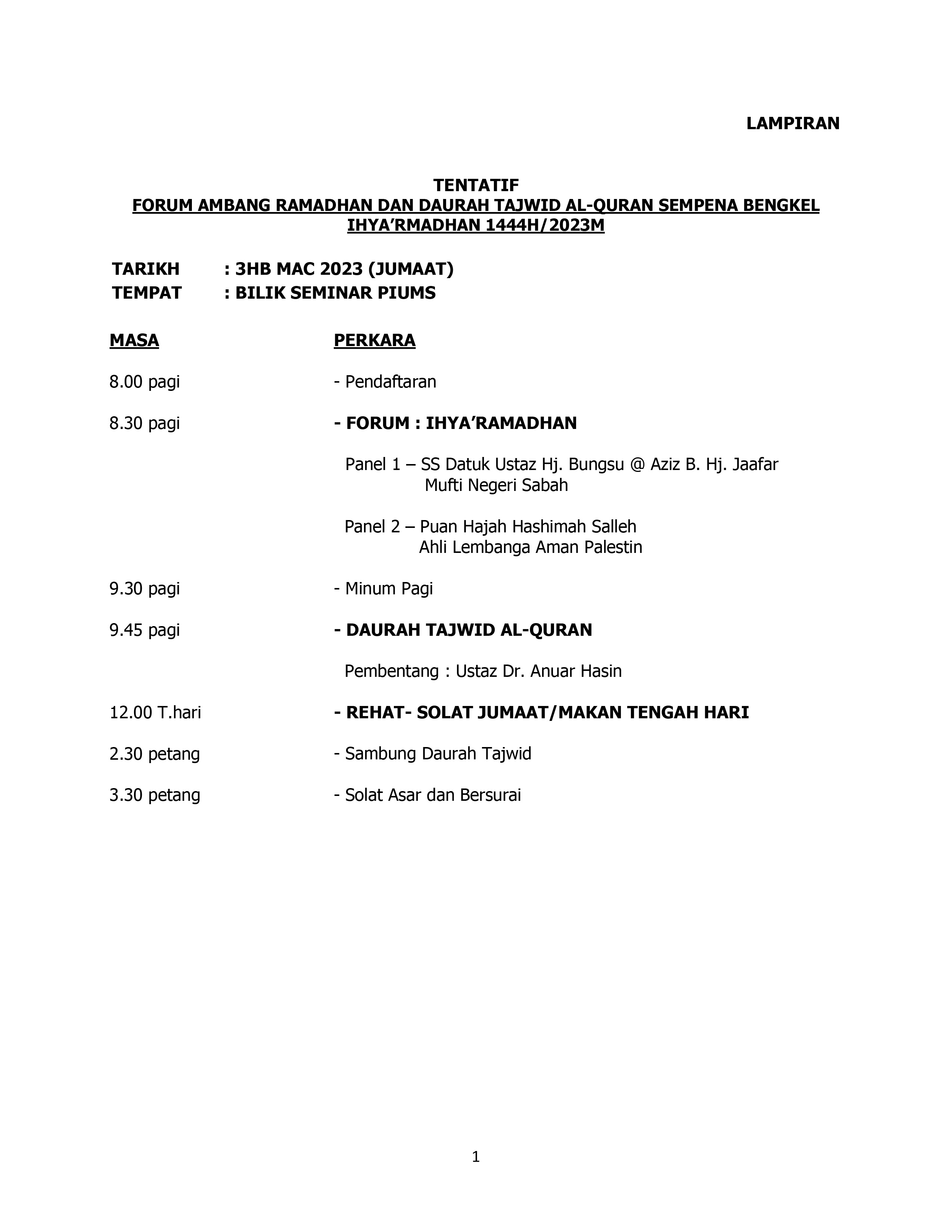 Tempat : Bilik Seminar, Pusat Islam UMS