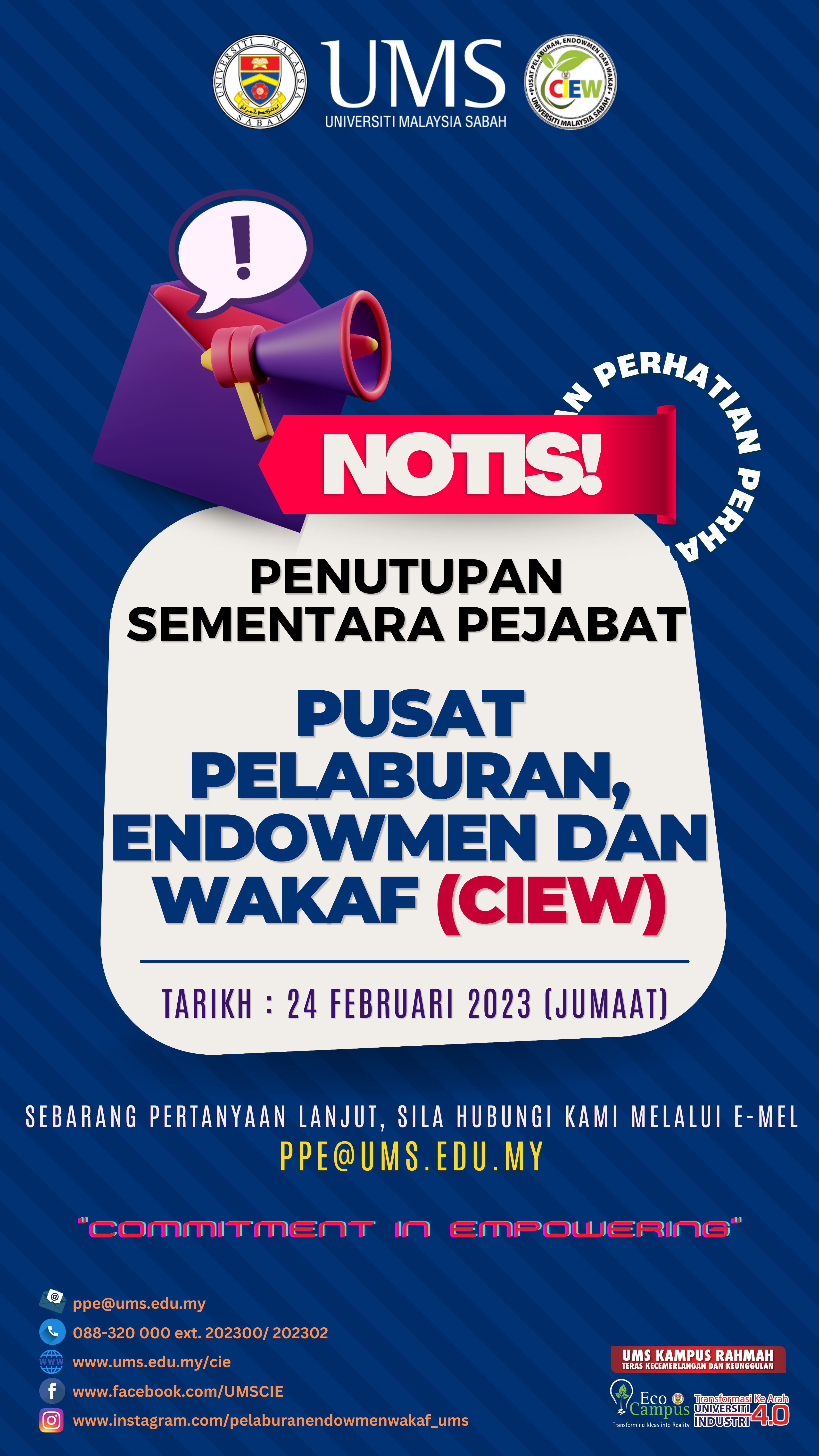 Dimaklumkan bahawa pejabat Pusat Pelaburan, Endowmen dan Wakaf (CIEW), Universiti Malaysia Sabah akan ditutup sementara pada 24 Februari 2023 (Jumaat) selama satu (1) hari sahaja dan akan beroperasi semula pada 27 Februari 2023 (Isnin). Sekian, terima kasih.