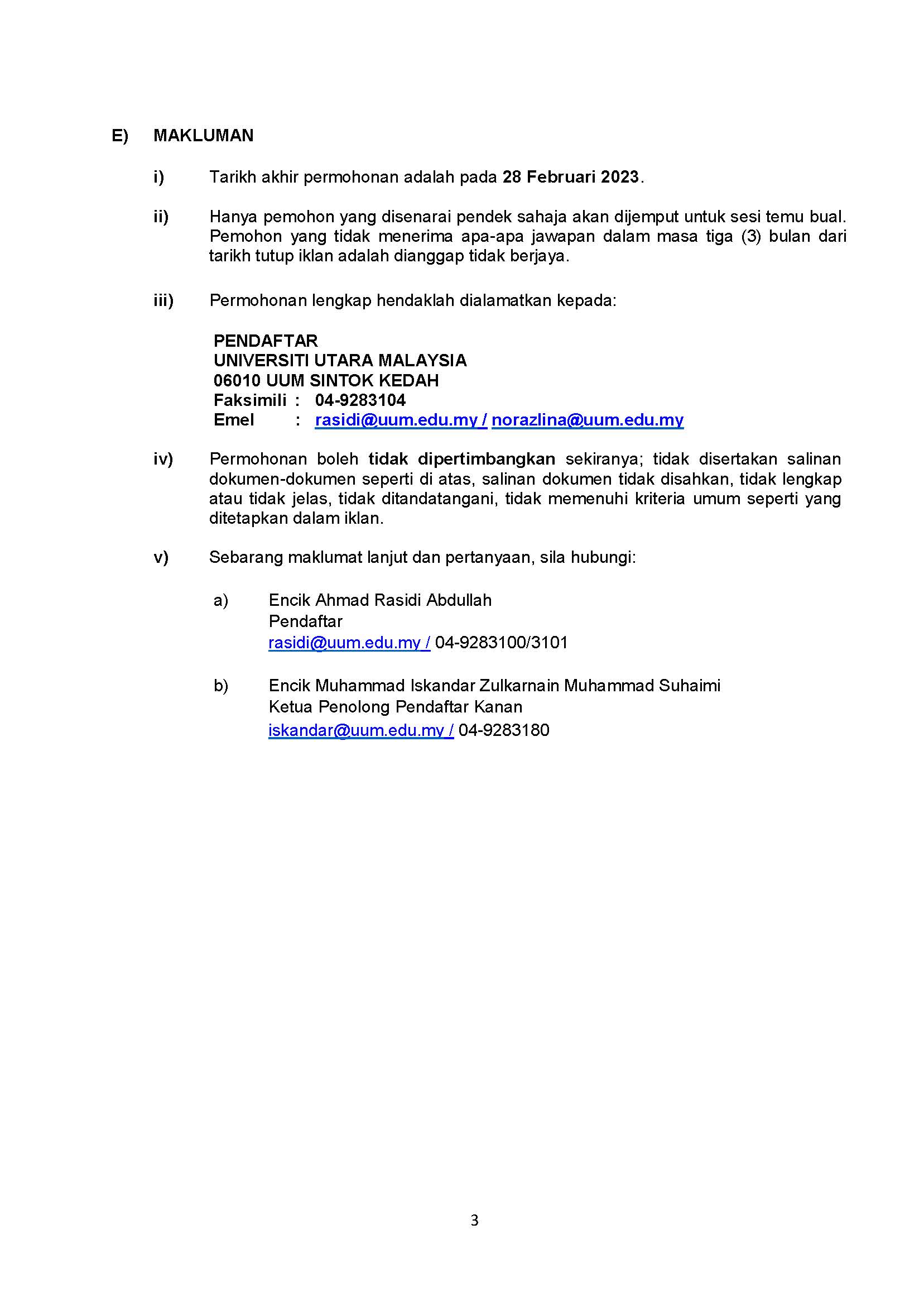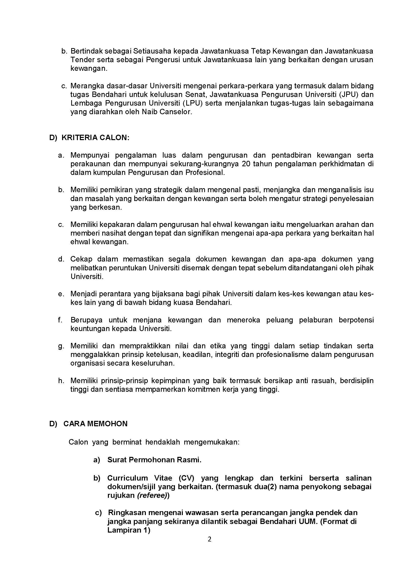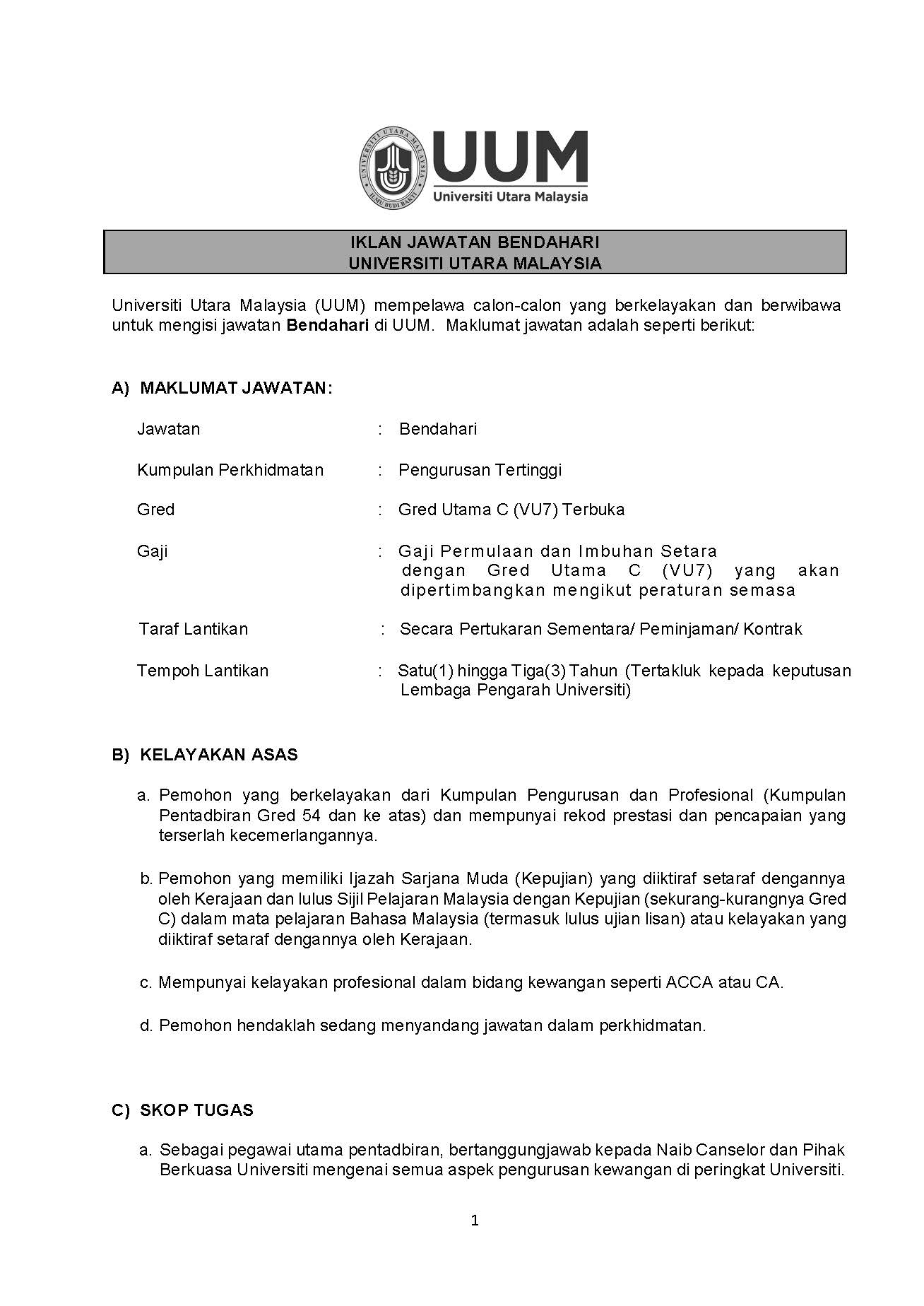Sila rujuk pautan ini: IKLAN JAWATAN BENDAHARI DI UNIVERSITI UTARA MALAYSIA (UUM)