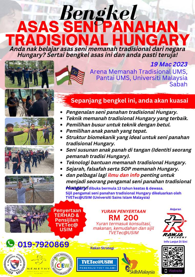 Rawja Archery ingin mengajak semua warga Universiti Malaysia Sabah untuk menyertai Bengkel Asas Seni Panahan Tradisional Hungary di arena memanah tradisional UMS. Sebarang pertanyaan lanjut sila hubungi pihak Rawja Archery di talian +6019-762 0869 atau imbas kod QR di poster.