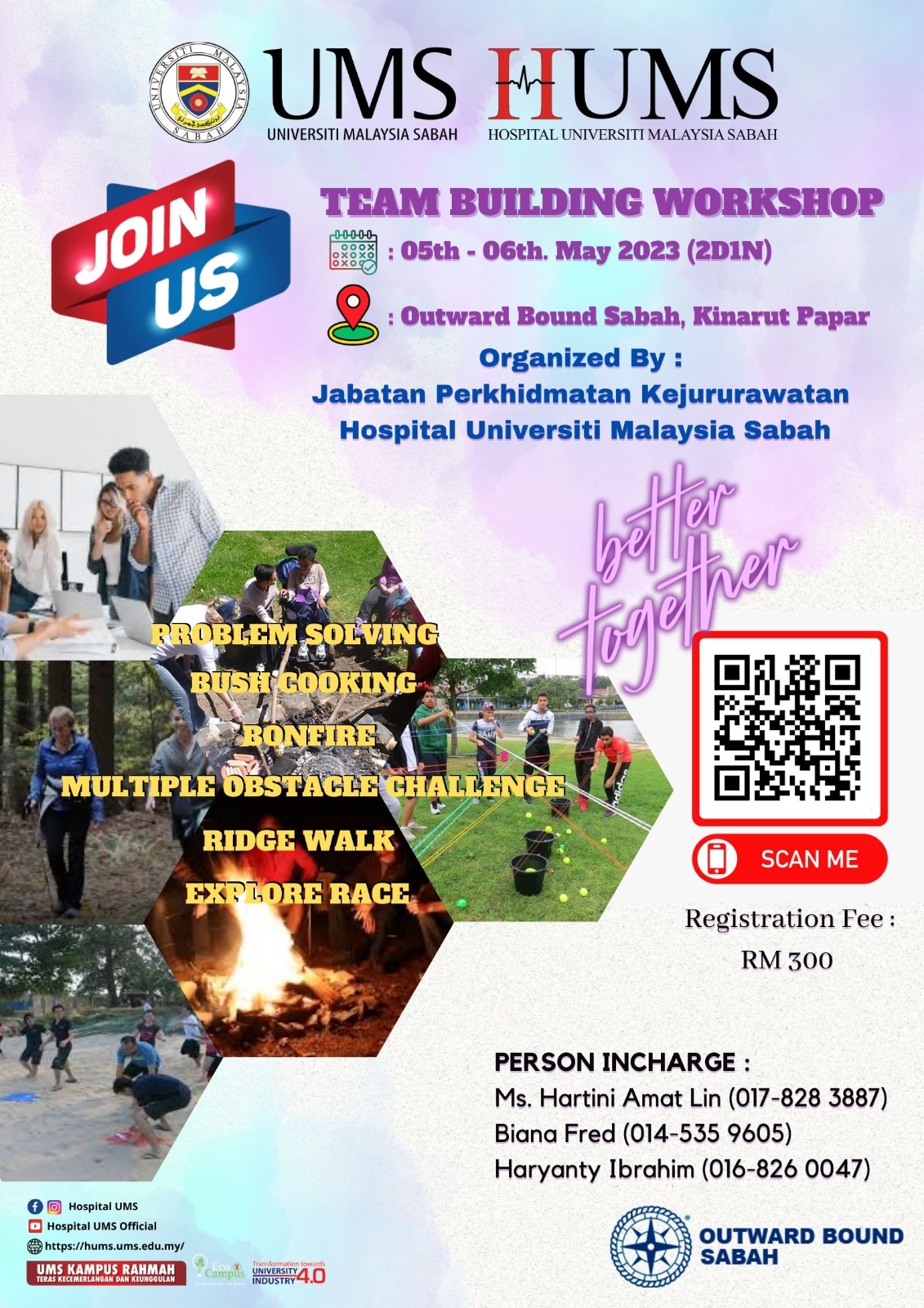 Sukacita dimaklumkan bahawa Bahagian Perkhidmatan Kejururawatan HUMS ingin menjemput semua kakitangan UMS yang ingin menyertai program “TEAM BUILDING WORKSHOP” yang akan diadakan pada 5 Mei 2023 – 6 Mei 2023 bertempat di Outward Bound Sabah, Kinarut. Bagi yang berminat, anda boleh mendaftar melalui QR code dan pembayaran boleh dibuat selepas urus setia membentuk kumpulan dalam group Aplikasi Whatsapp.