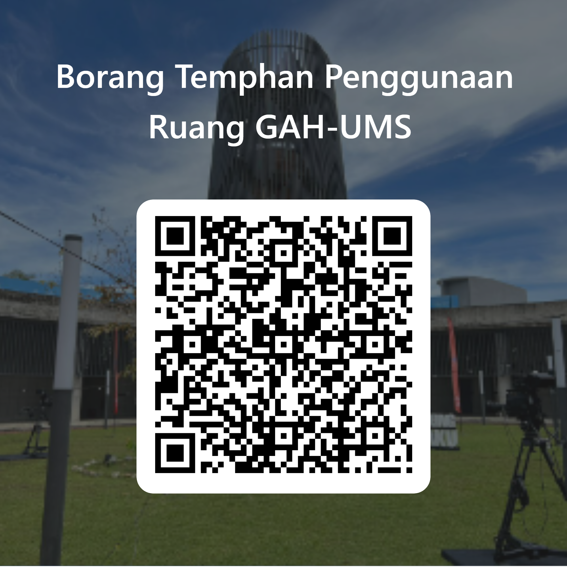 Pihak Galeri Azman Hashim UMS telah mula menggunakan Borang Tempahan Penggunaan Ruang Galeri Azman Hashim UMS bagi tujuan melancarkan proses permohonan penggunaan ruang di GAH-UMS. YBrs. Prof./Datuk/Datin/Dr./Tuan/Puan boleh mengimbas kod QR atau membuat permohonan melalui pautan URL: https://forms.office.com/r/cNeQKu70vw .