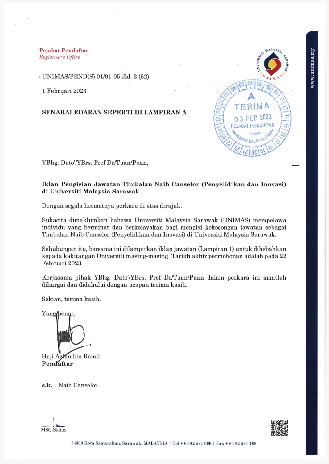 Maklumat lanjut, sila rujuk pautan ini: IKLAN PENGISIAN JAWATAN TIMBALAN NAIB CANSELOR (PENYELIDIKAN & INOVASI) DI UNIMAS