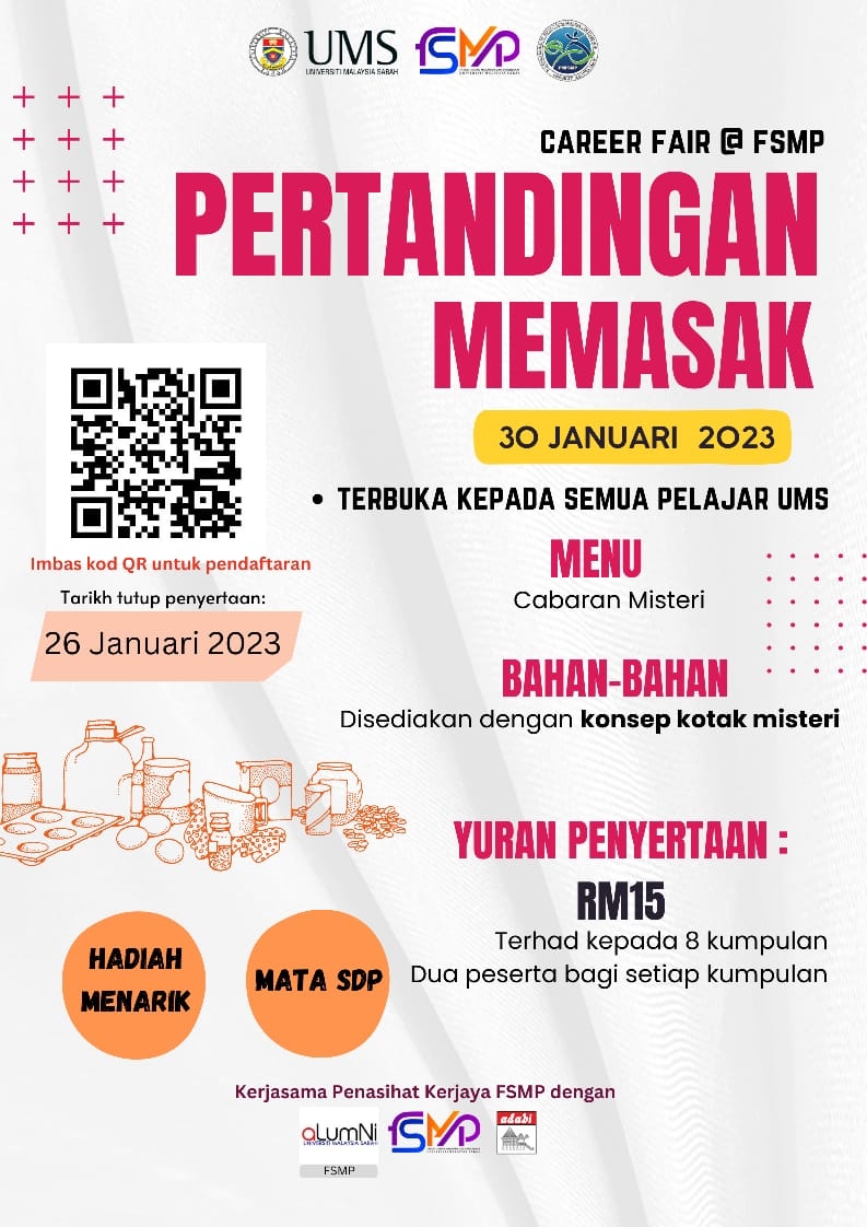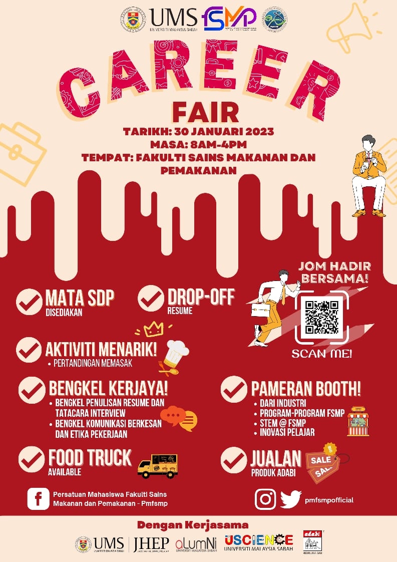 Sukacita dimaklumkan bahawa Penasihat Kerjaya dan Persatuan Mahasiswa Fakulti Sains Makanan dan Pemakanan (PMFSMP) Sesi 2022/2023 Universiti Malaysia Sabah (UMS) akan melancarkan program Career Fair@FSMP pada 30 Januari 2023.