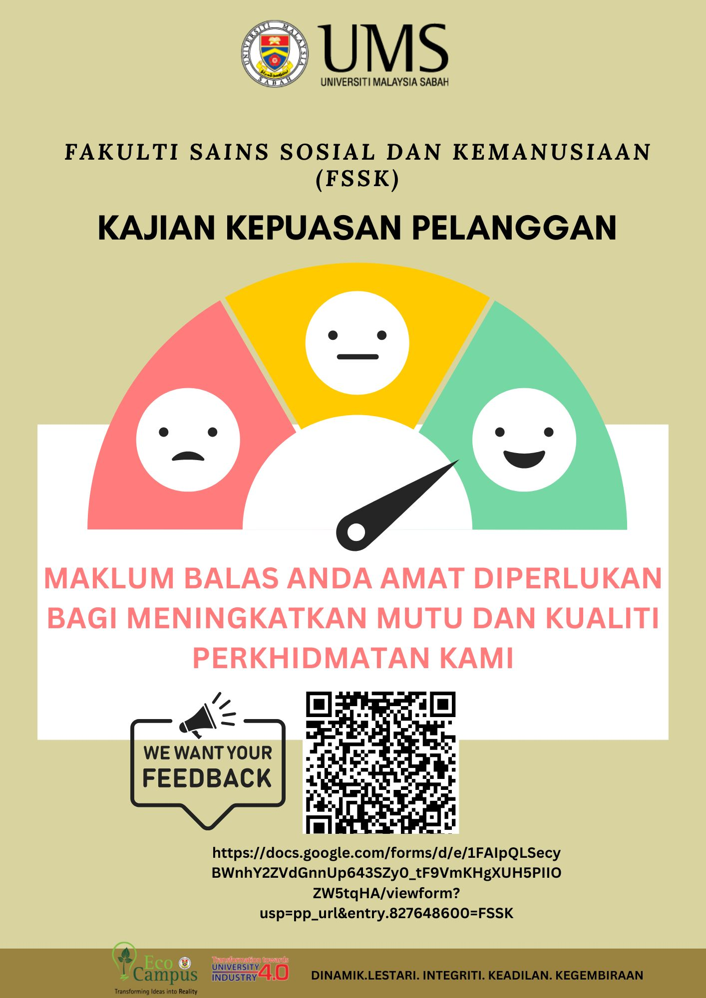 Fakulti Sains Sosial dan Kemanusiaan (FSSK) ingin mengucapkan terima kasih kerana menggunakan perkhidmatan kami. Bagi tujuan meningkatkan kualiti perkhidmatan, pihak kami memohon maklum balas daripada YBhg. Datuk/ YBrs. Prof./ Dr./ Tuan/ Puan untuk melengkapkan soal selidik kajian kepuasan pelanggan melalui imbasan kod QR di poster atau pautan yang berikut;