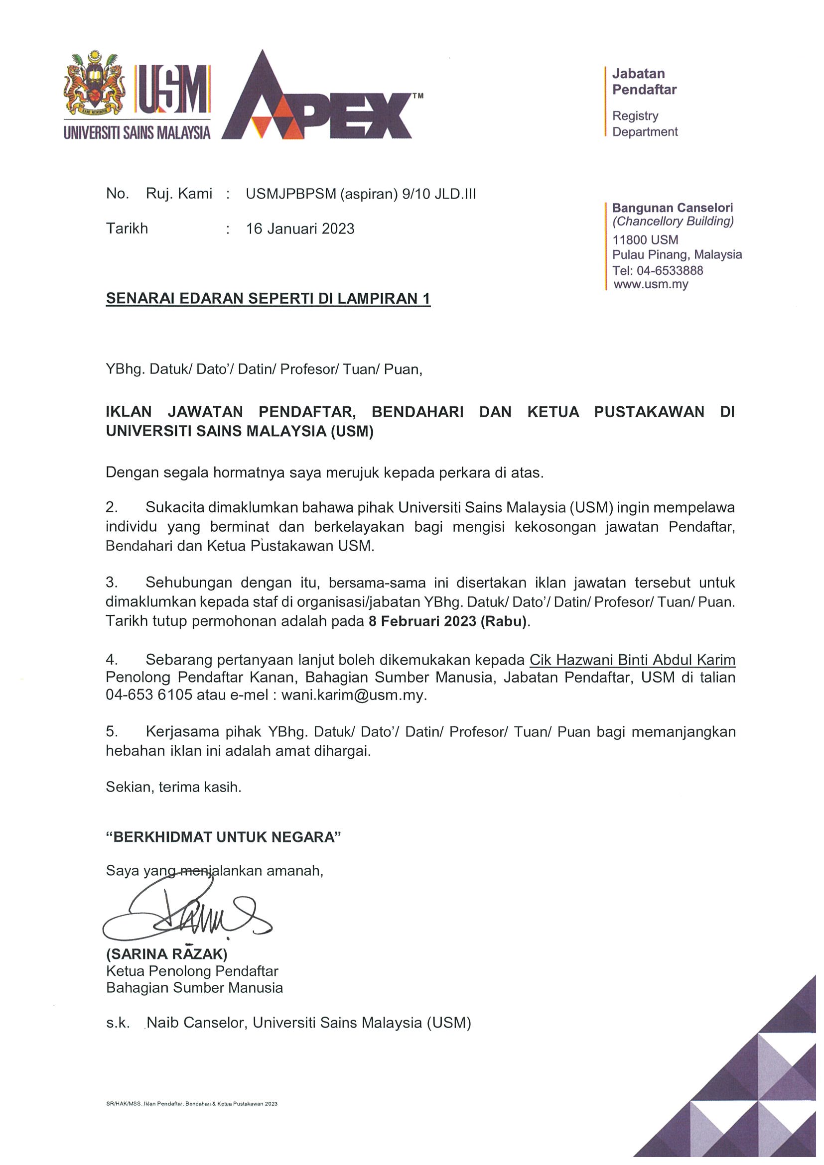 Tarikh tutup permohonan adalah sebelum atau pada 3 Februari 2023 (Jumaat). Permohonan yang tidak lengkap dan lewat diterima daripada tarikh yang dinyatakan tidak akan dipertimbangkan.