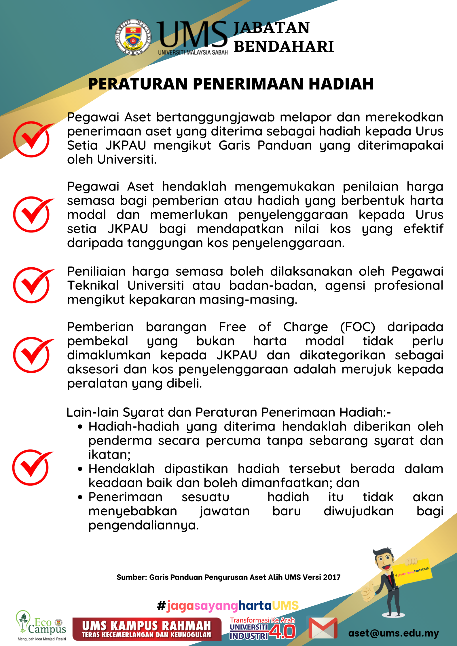 Sekiranya terdapat sebarang pertanyaan berkaitan boleh menghubungi Sektor Pengurusan Harta & Risiko di alamat emel Alamat emel ini dilindungi dari Spambot. Anda perlu hidupkan JavaScript untuk melihatnya.