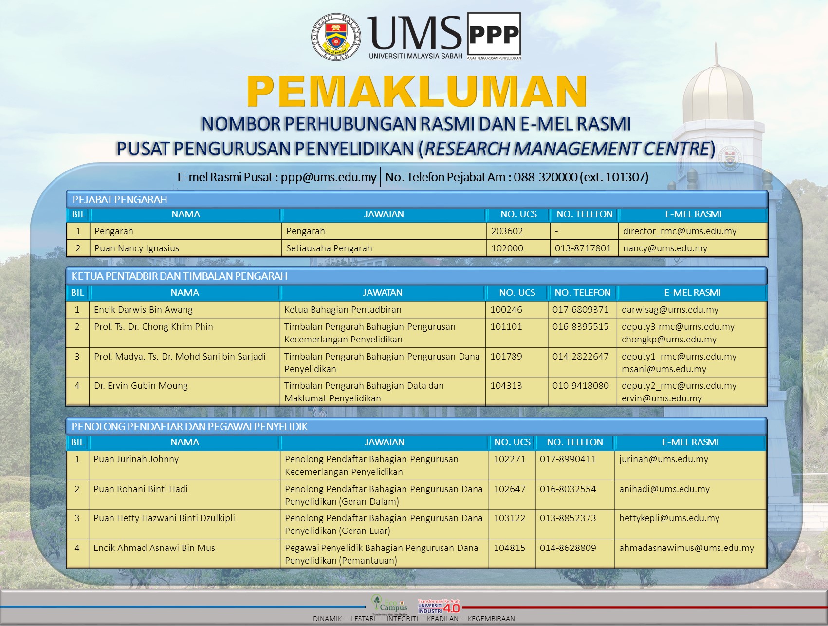 Pemakluman Nombor Perhubungan dan E-Mel Rasmi Pusat Pengurusan Penyelidikan