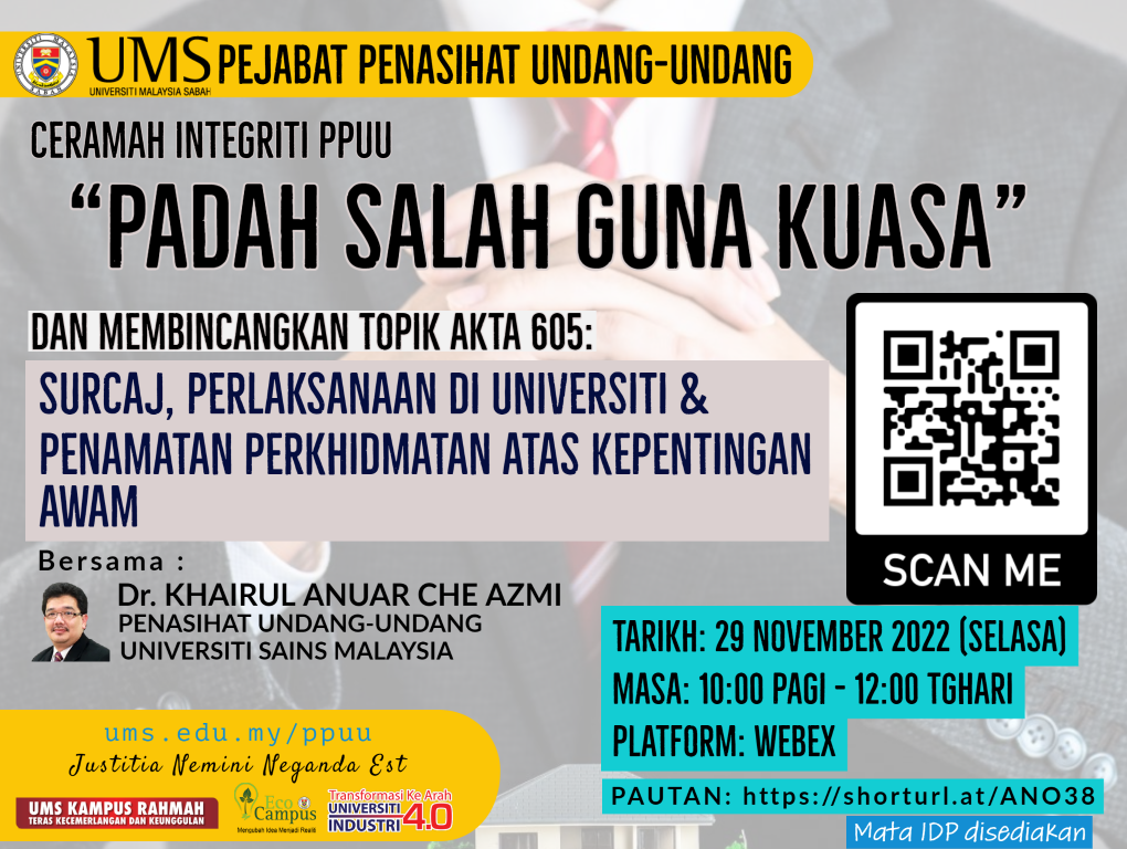 Pejabat Penasihat Undang-Undang UMS akan mengadakan sesi perkongsian pada ketetapan berikut :